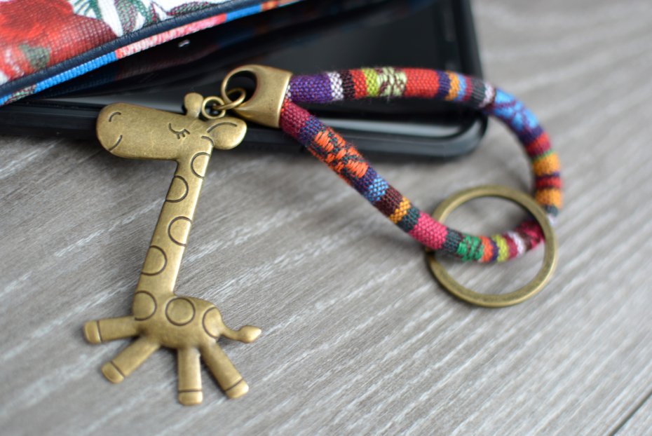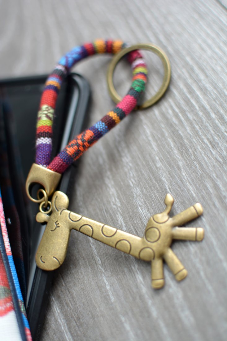 Uroczy brelok do kluczy w stylu boho wykonany z szytego rzemienia (liny materiałowej z tkaniny o wyraźnym splocie) o śr. ok. 6mm, którego ozdobę stanowi zabawna, dwustronna, metalowa zawieszka w kształcie żyrafy o długości 7cm.