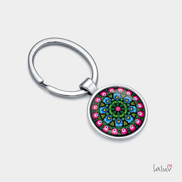 Ręcznie robiony brelok z wysokiej jakości grafiką zamkniętą pod wypukłym szkiełkiem i oprawioną w bazę w kolorze srebrnym.