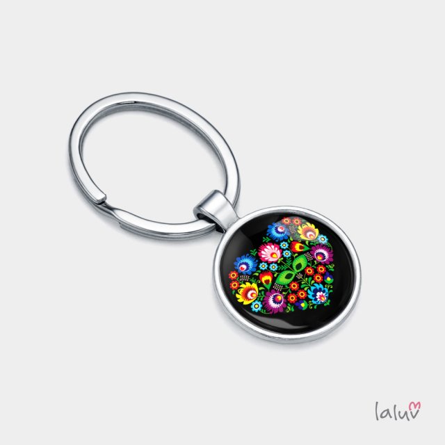 Ręcznie robiony brelok z wysokiej jakości grafiką zamkniętą pod wypukłym szkiełkiem i oprawioną w bazę w kolorze srebrnym.