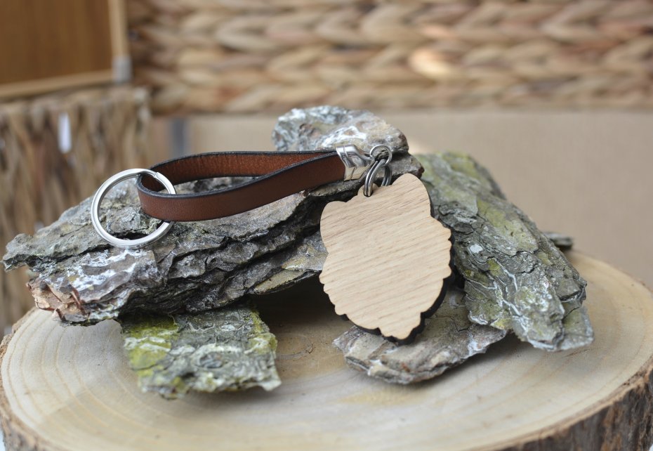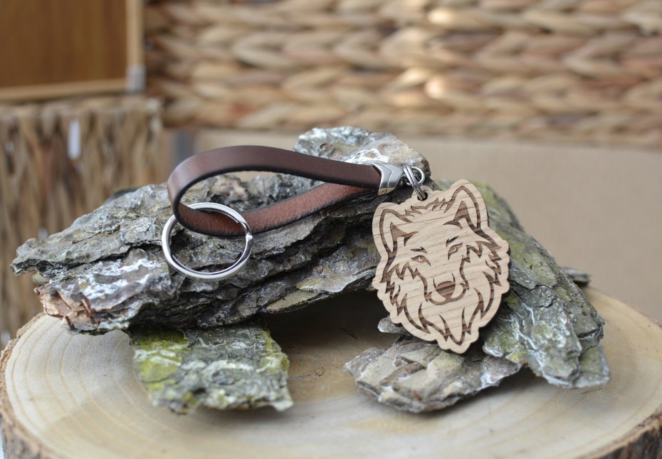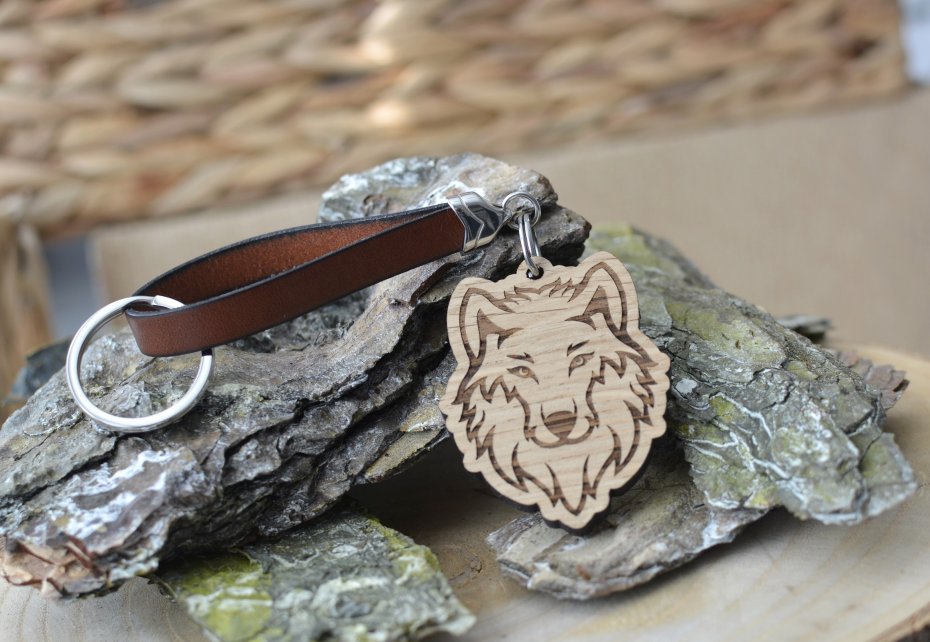 Brelok do kluczy wykonany z płaskiego rzemienia skórzanego w kolorze brązowym (o szerokości 1cm) oraz drewnianej zawieszki w kształcie głowy wilka (wysokość: 6cm, szerokość: 4,5cm, grubość drewna 0,5cm). Ozdoba breloka została wycięta laserowo z litego drewna dębowego (NIE ZE SKLEJKI!). Do umocowania kluczy służy okrągłe, solidne kółko o średnicy ok. 3cm. Wszystkie elementy metalowe użyte do wykonania breloka to antyalergiczna, wytrzymała i nie zmieniająca z upływem czasu swej barwy stal szlachetna.