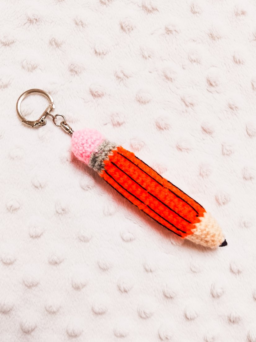 Brelok z motywem ołówka w kolorze pomarańczowym. Wykonany ręcznie, na szydełku z miękkiej włóczki. Zawieszka metalowa, kołowy karabińczyk.