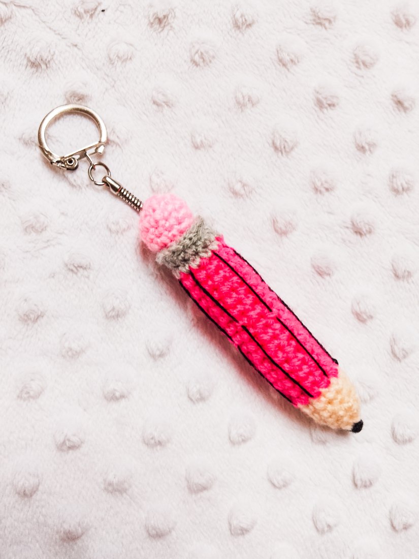 Brelok z motywem ołówka w kolorze różowym. Ręcznie dziergany na szydełku z miękkiej włóczki i wypełnienia. Idealny na prezent, także na Dzień Nauczyciela.