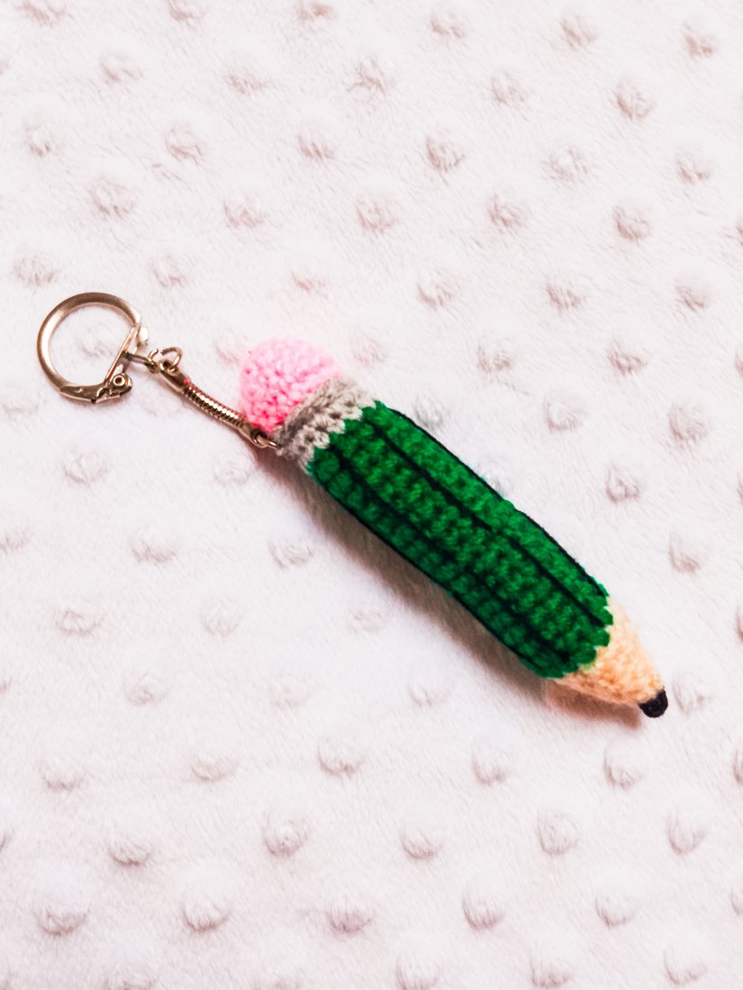 Brelok z motywem ołówka w kolorze zielonym. Ręcznie dziergany na szydełku z miękkiej włóczki i wypełnienia.