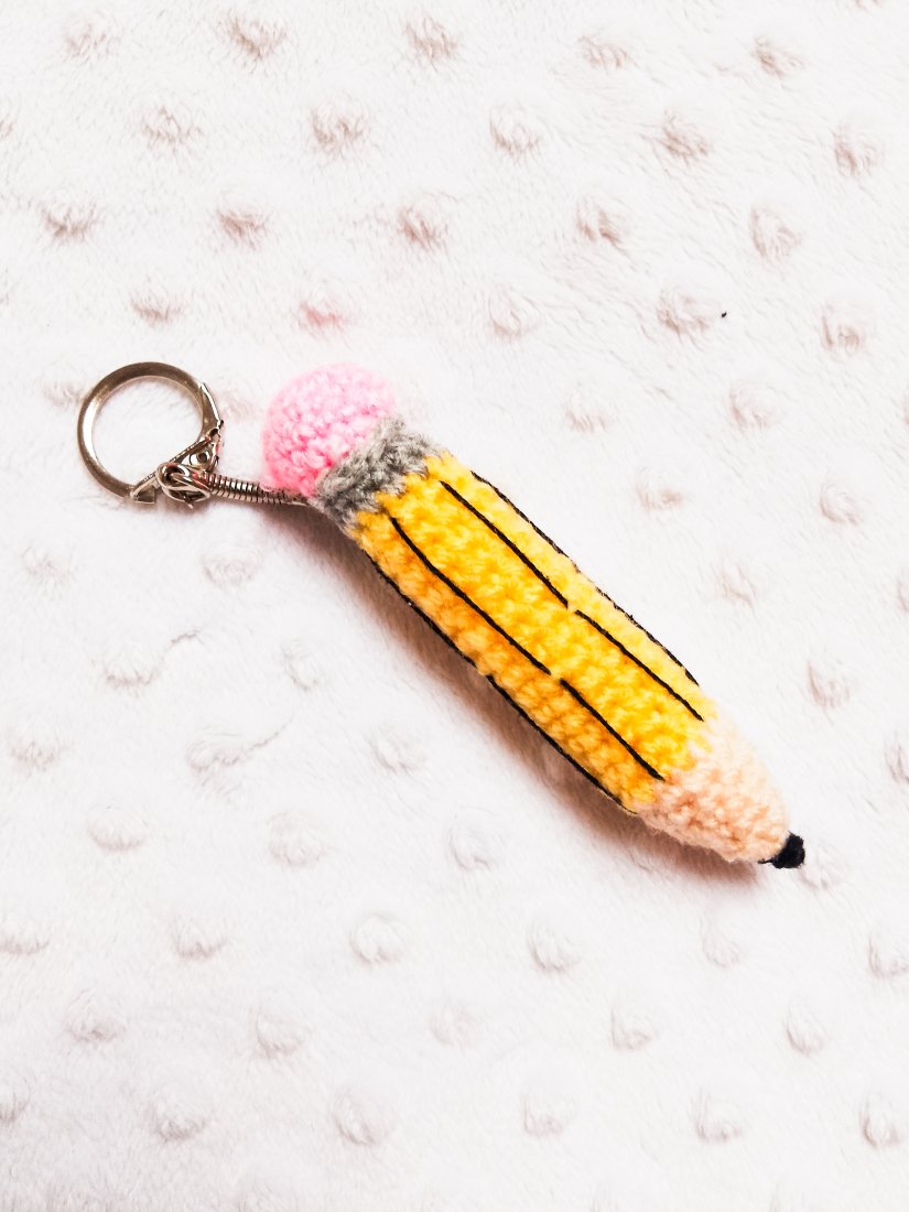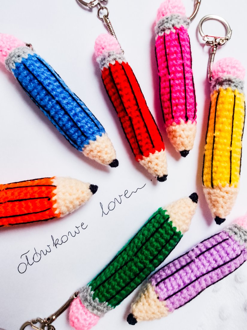 Brelok z motywem ołówka w kolorze żółtym. Ręcznie dziergany na szydełku. Zawieszka zakończona zapinanym kółeczkiem. Brelok miękki ,lekki.
