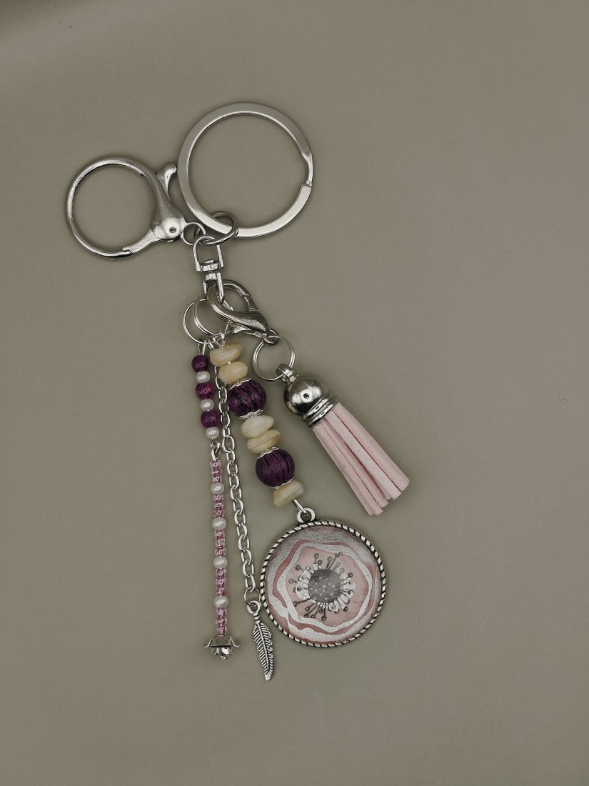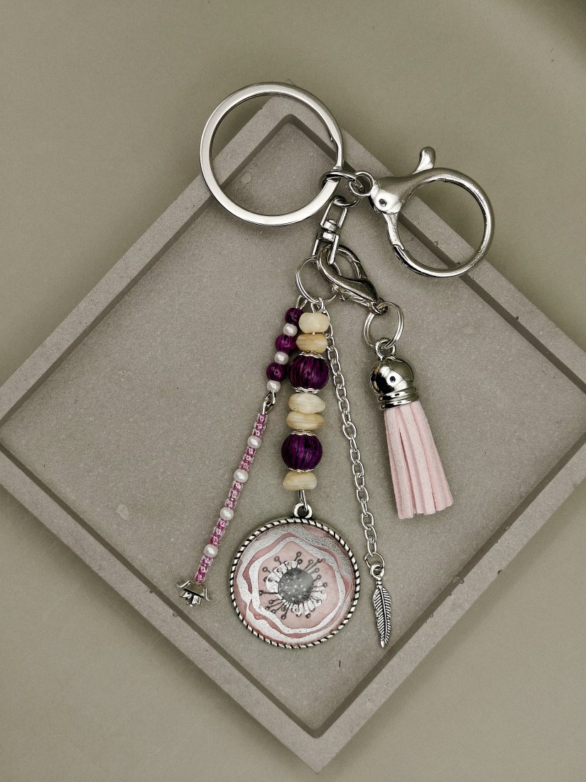 Wyjątkowy brelok handmade, który łączy delikatność pudrowego różu z elegancją srebrnych detali. Kompozycja koralików, subtelnego chwosta oraz okrągłej zawieszki z motywem kwiatowym sprawia, że brelok jest nie tylko praktycznym dodatkiem, ale także stylową biżuterią do kluczy, torebki lub plecaka. Idealny dla osób ceniących unikatowe, ręcznie wykonane akcesoria z duszą.