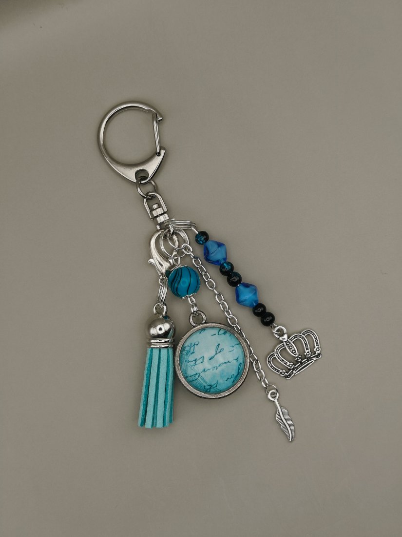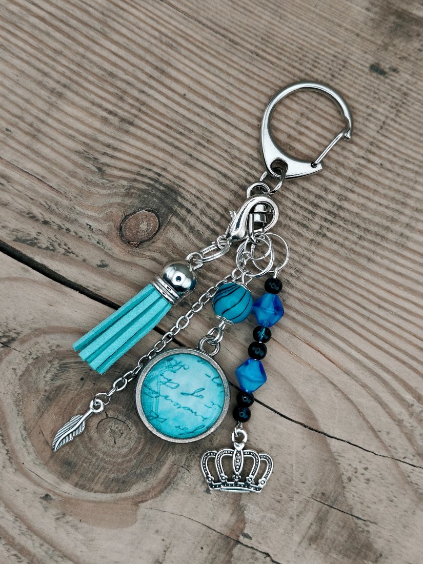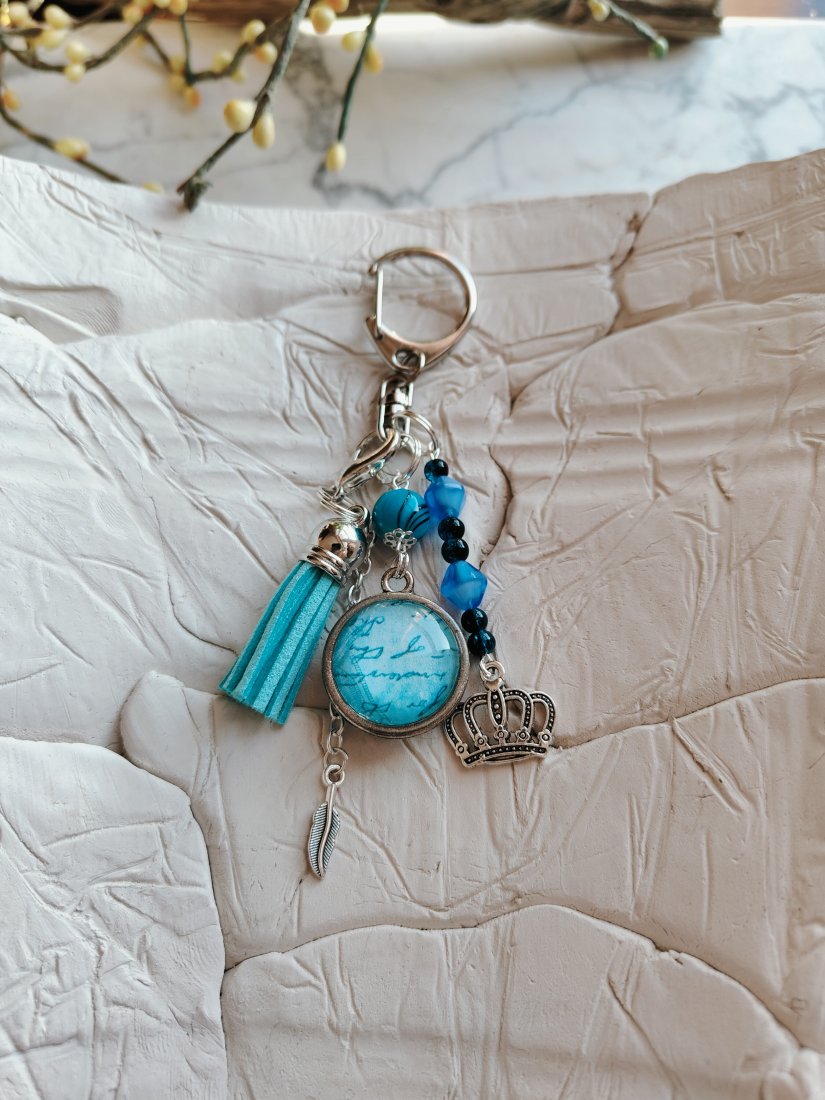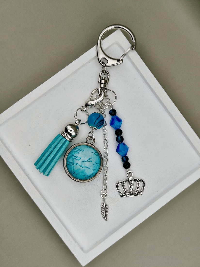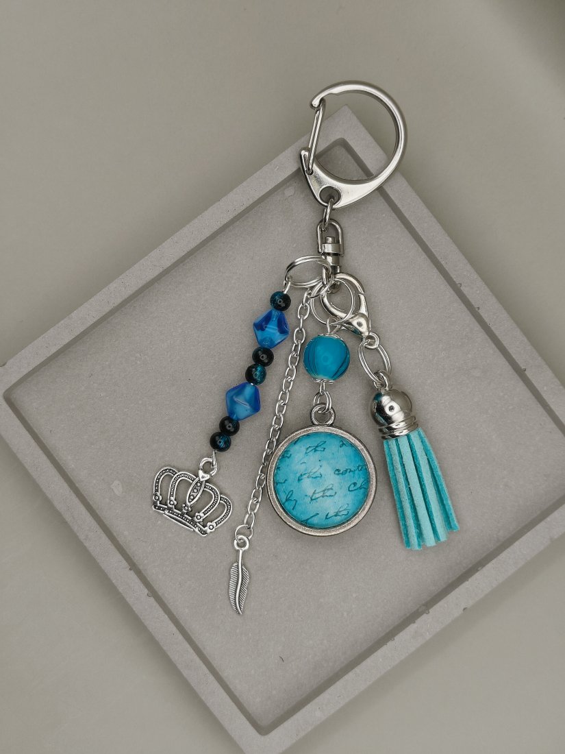 Brelok Turkusowa Korona to wyjątkowy dodatek, który łączy elegancję z nutą boho. Utrzymany w odcieniach turkusu i błękitu, przyciąga wzrok starannie dobranymi detalami: ozdobnym chwostem, dekoracyjnymi koralikami oraz subtelnymi metalowymi zawieszkami. Centralnym punktem breloka jest okrągła zawieszka z turkusowym motywem i delikatnym, rękopiśmiennym wzorem, która nadaje całości artystycznego charakteru. Zawieszka w kształcie korony dodaje symboliki siły i wyjątkowości, a piórko lekkości i swobody. Idealny jako stylowy brelok do kluczy, torebki lub plecaka, a także jako oryginalny prezent.