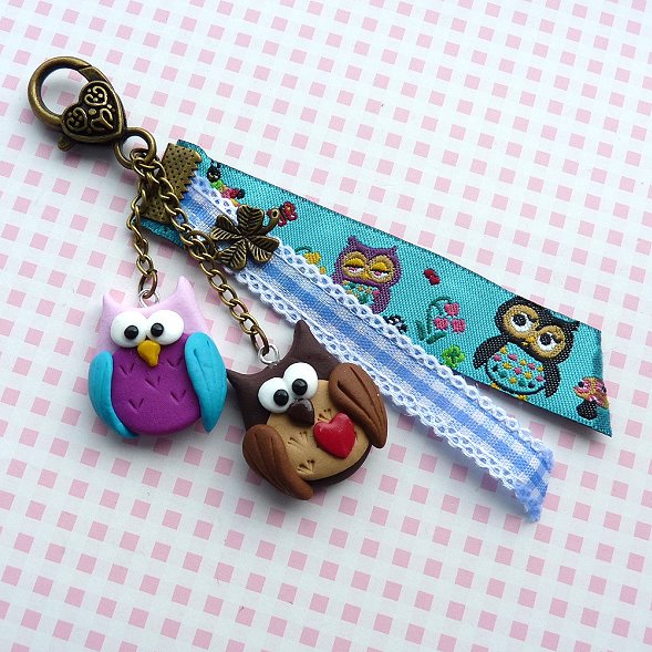 Oryginalny brelok z miniaturowymi sówkami, koniczynką i pasującymi kolorystycznie tasiemkami:) długość breloka: ok.10cm, wysokość jednej sówki: 2,5cm. Wysyłam ozdobnie zapakowany;)