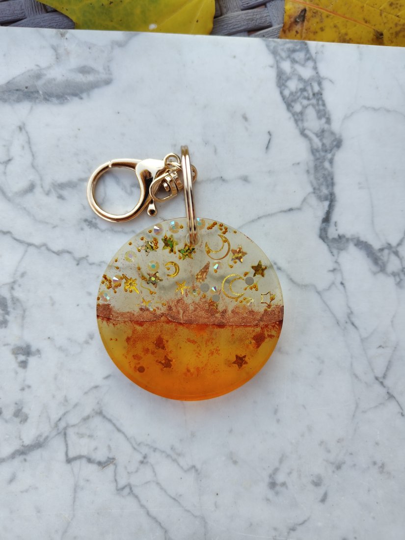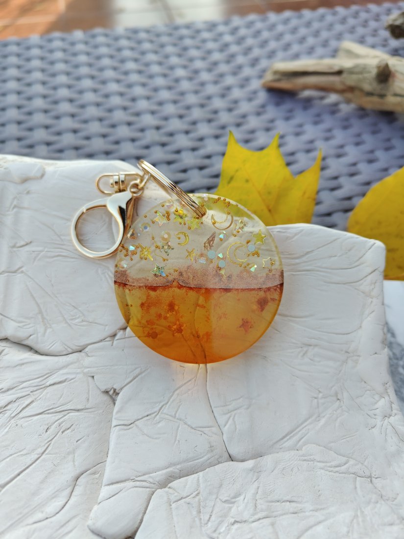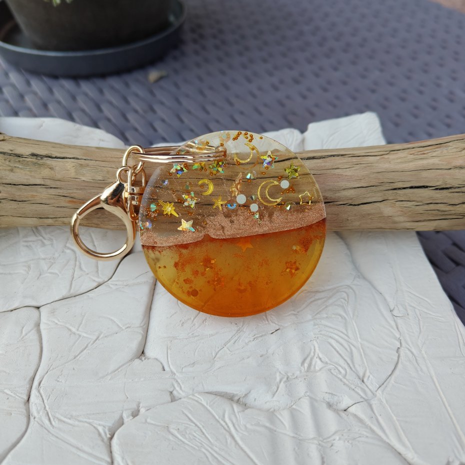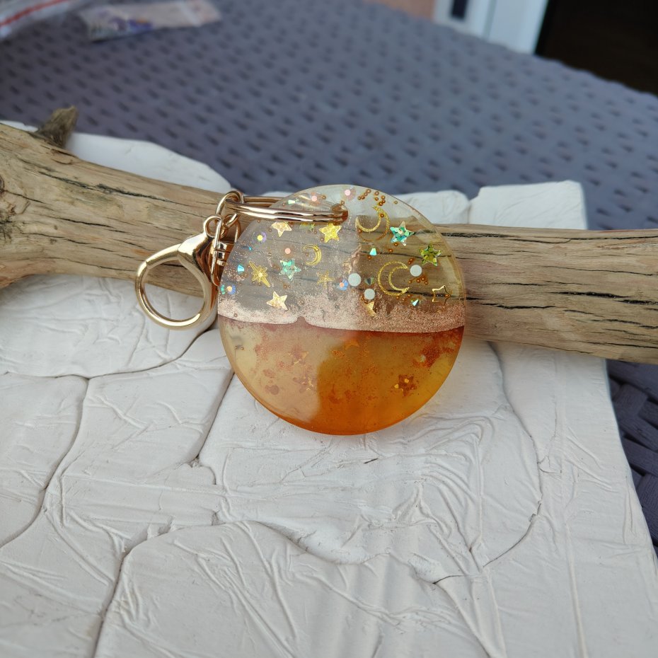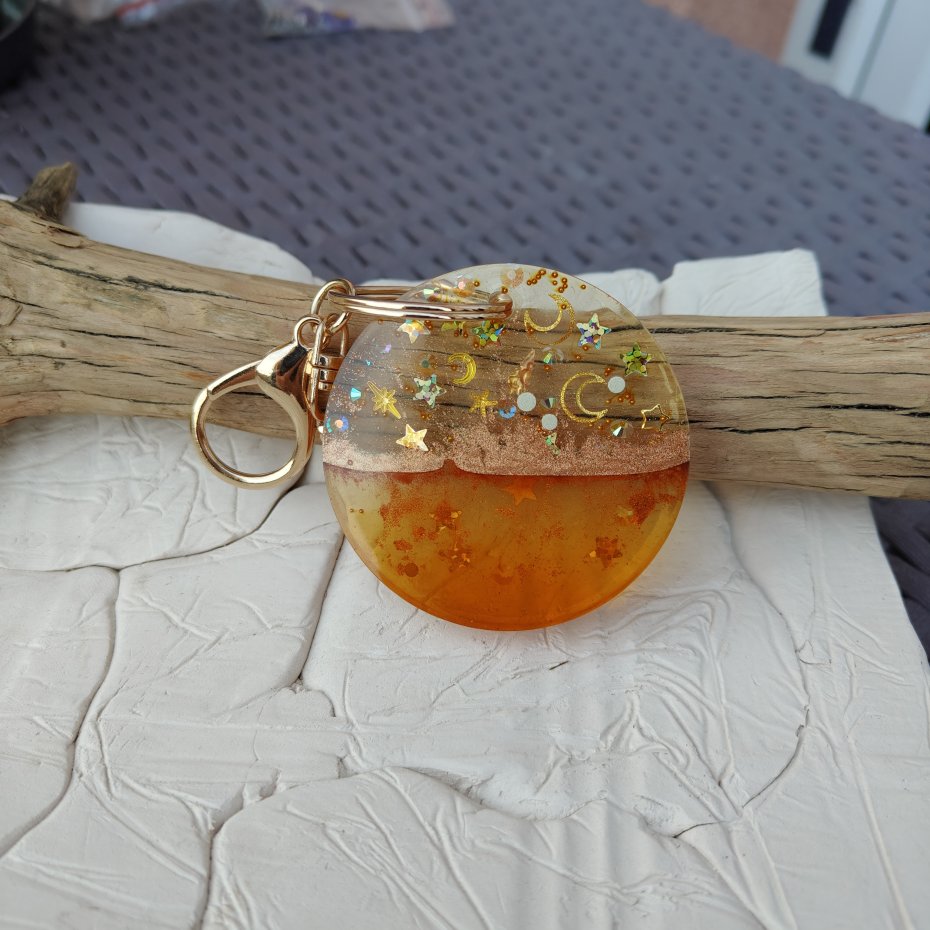 Ręcznie wykonany brelok z przezroczystej żywicy epoksydowej, inspirowany ciepłymi barwami zachodu słońca i motywem nocnego nieba. W górnej części zatopione zostały złote księżyce, gwiazdki oraz drobinki brokatu, które pięknie połyskują w świetle. Dolna część ma głęboki, pomarańczowo-złoty odcień przypominający bursztyn. Całość tworzy efektowną, harmonijną kompozycję, idealną jako ozdoba kluczy, torebki lub plecaka.