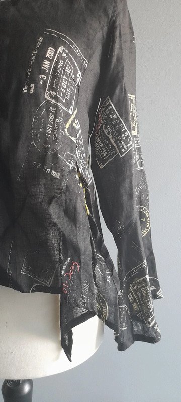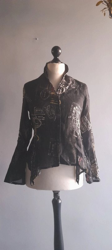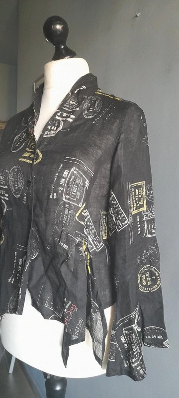 Świetna asymetryczna koszula, lekko taliowana, cienki len z printem, świetna kolorystyka, fason I całość, nowa bez papierowej metki , rękaw dzwon, w realu plus 100%, szerokość pod paczami z tyłu 48, przód trochę więcej