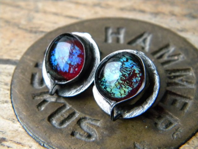 kolczyki wykonane ze szklanych kaboszonów (wyrób własny) oprawionych w ocynowaną miedz. Jeden z kaboszonów mieni się bardziej na zielono, drugi na niebiesko.