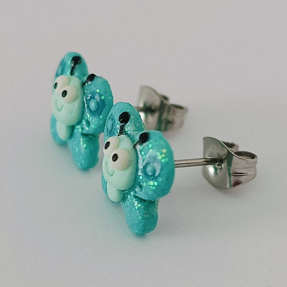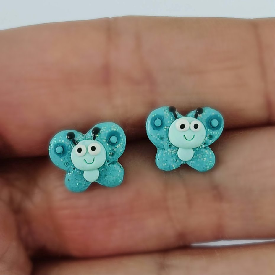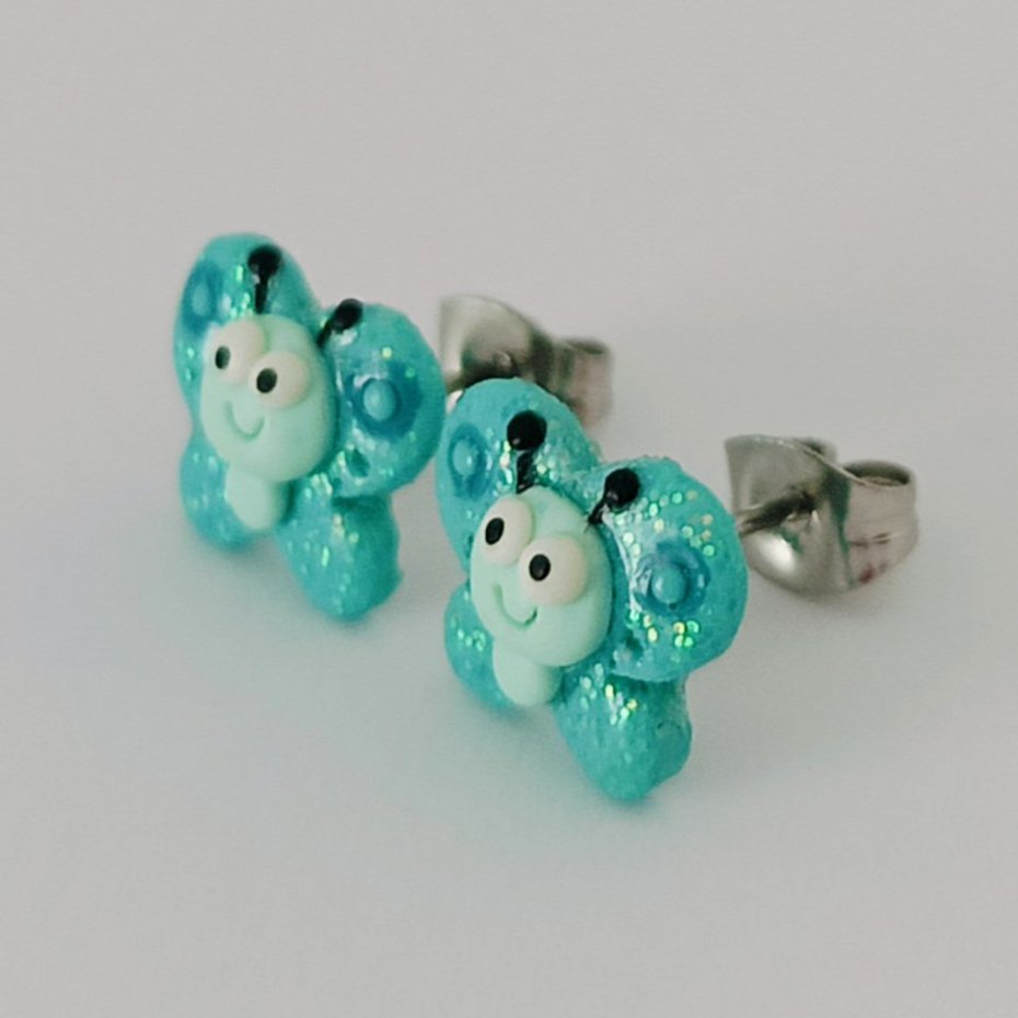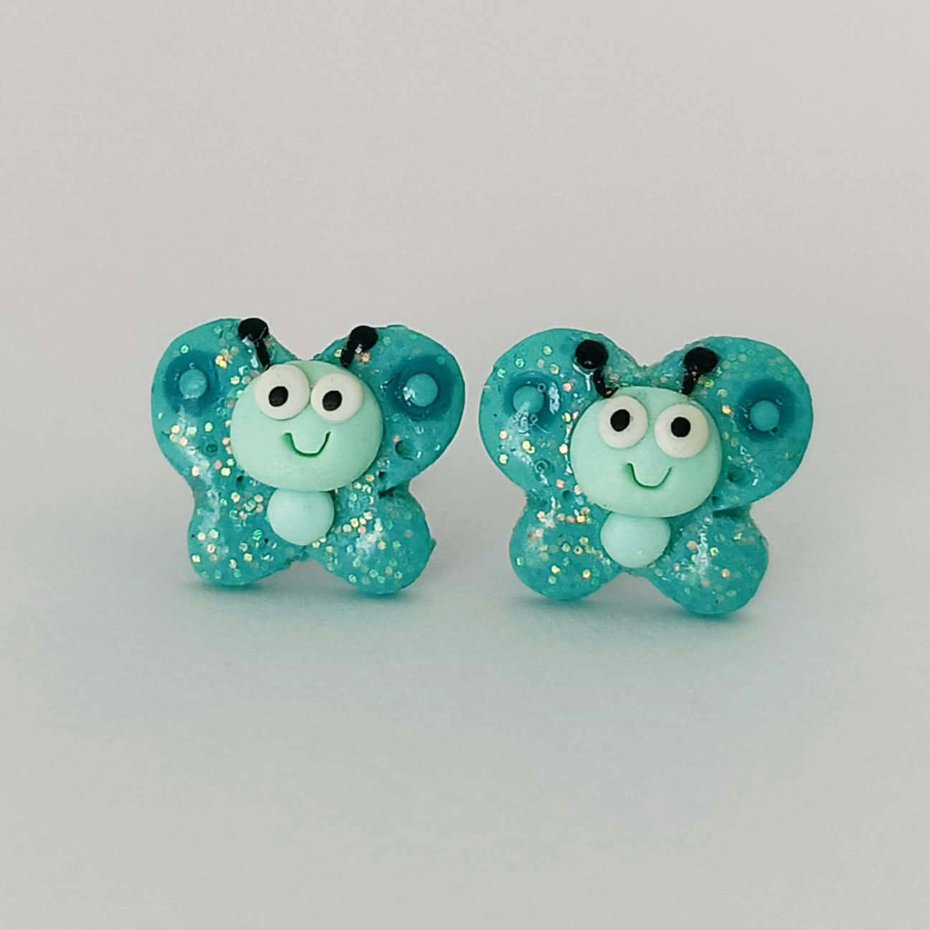 Urocze kolczyki w kształcie motylków, ręcznie wykonane z masy polimerowej. Turkusowy kolor z delikatnym brokatem pięknie odbija światło i dodaje lekko bajkowego charakteru.