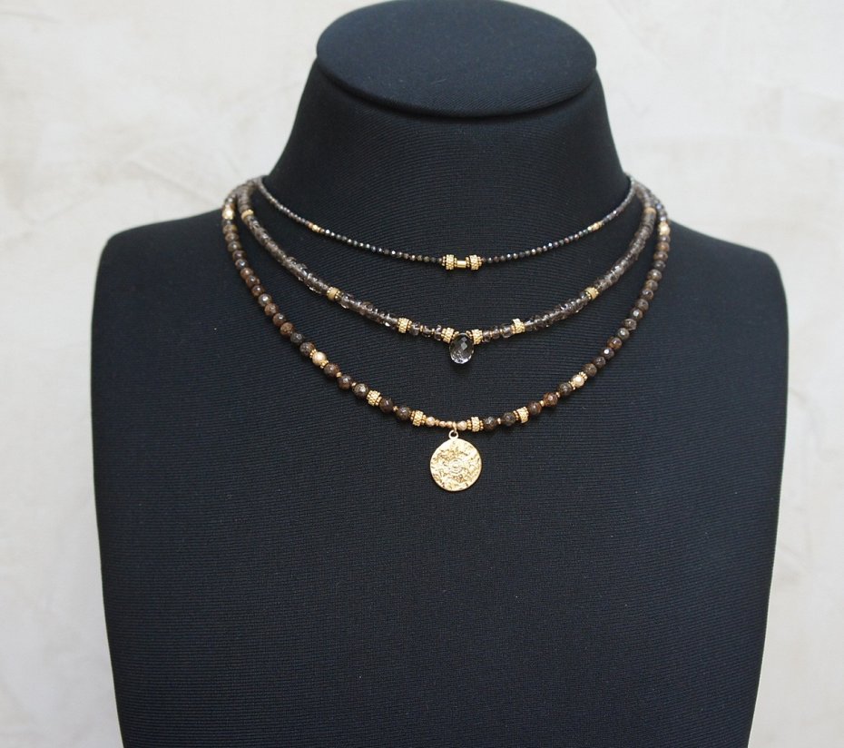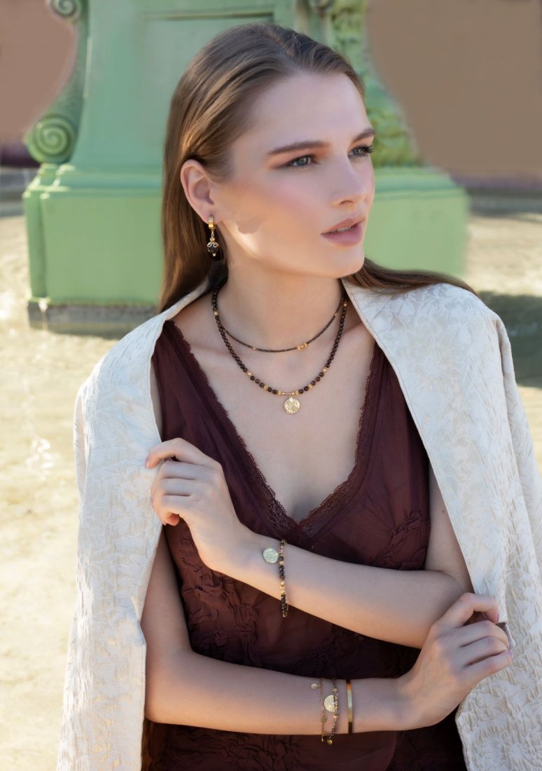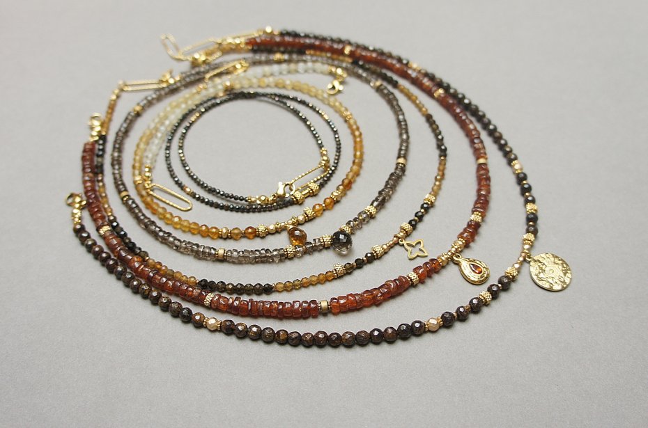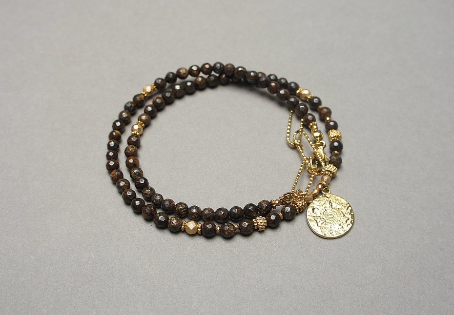 Krótki, delikatny naszyjnik wykonany w całości z pozłacanej stali szlachetnej oraz naturalnych kamieni - kuleczki fasetowane bronzytu [4mm], cytrynów fasetowanych [3mm], przekładek z hematytu [1mm], fasetowanych, platerowanych hematytów [4mm, 3mm i 2mm]. Naszyjnik regulowany o długości od. 41,5cm do 45,5cm. Do kompletu można dokupić bransoletkę przedstawioną na zdjęciach.