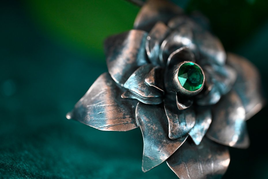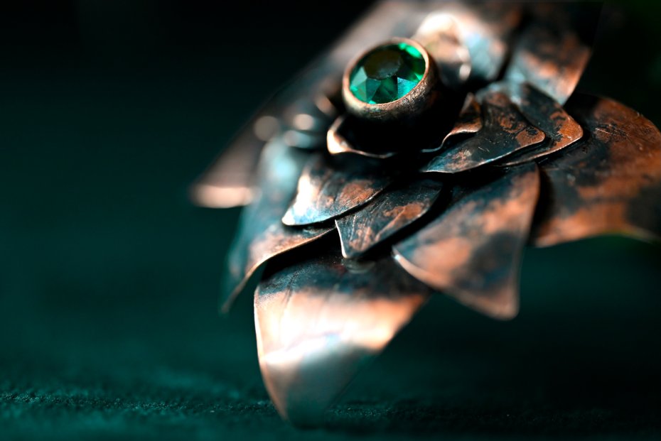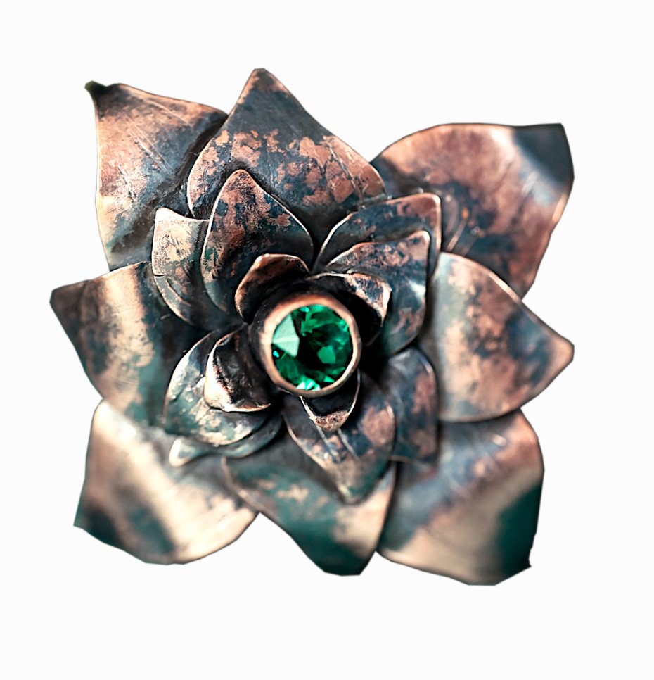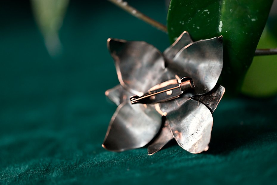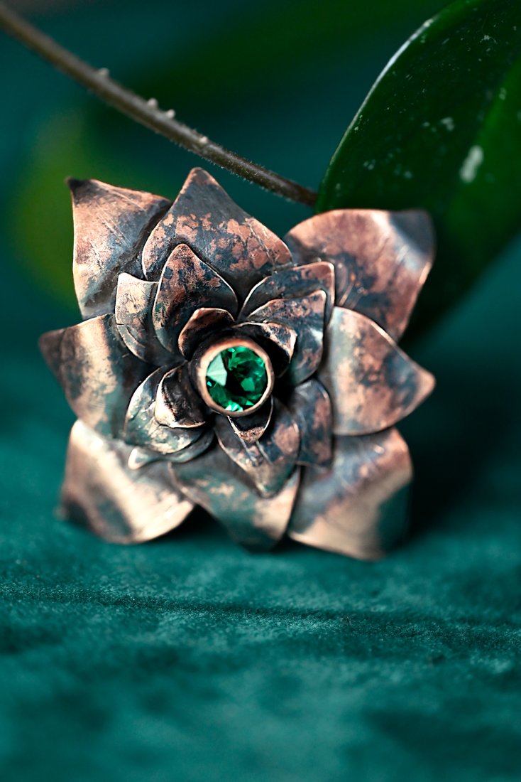 Tagi: #autorski projekt, #broszka kwiat, #miedziana biżuteria, #zielony kamień