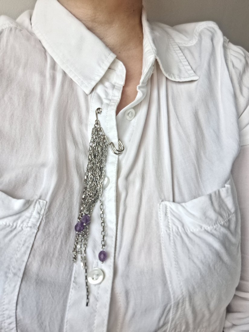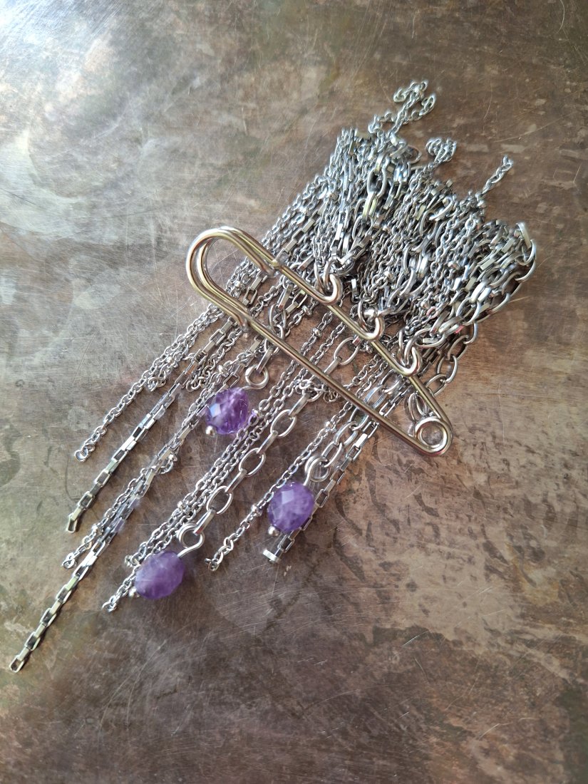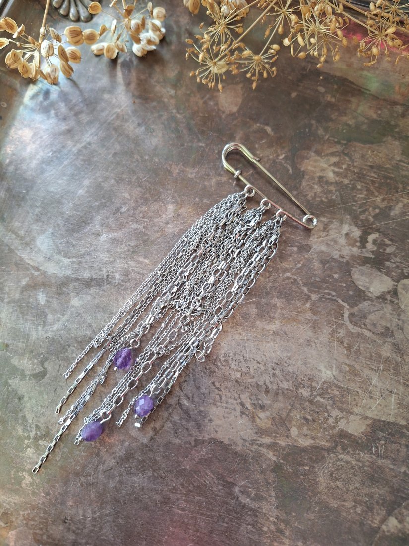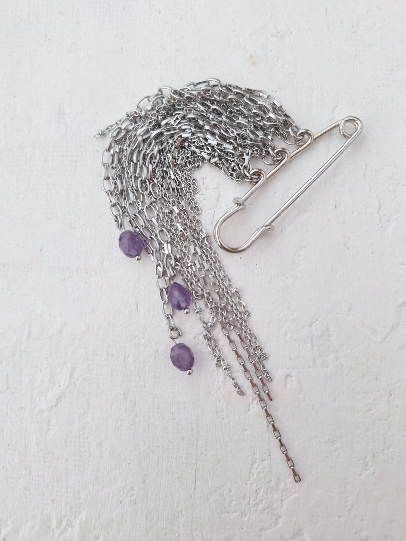 Duża agrafka z zamontowanymi trzema pękami różnego rodzaju łańcuszków, z trzema fasetowanymi ametystami około 5x8mm.