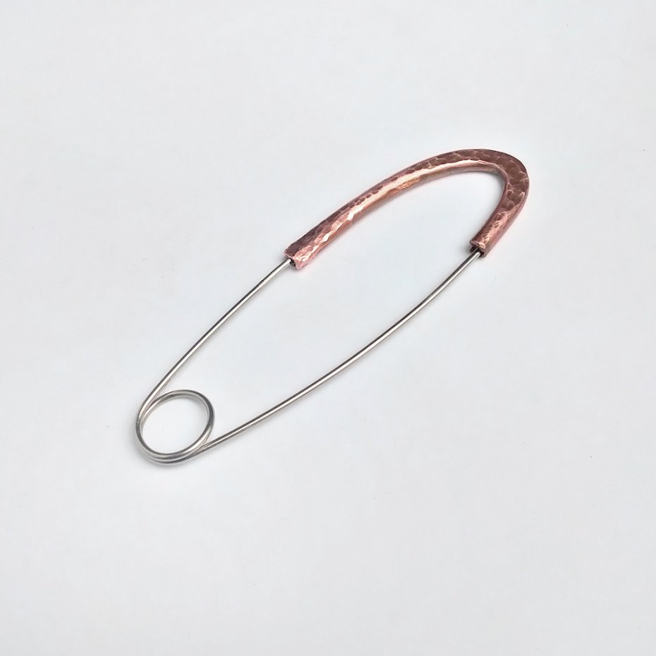 Broszka w formie agrafki, wykonana z rurki miedzianej fi5mm lub fi 6mm i drutu ze stali szlachetnej 316L fi 1,5mm. Repusowana, ręcznie kuta i formowana, oksyda termiczna, ręczne przecieranie. Doskonała rzecz na prezent na każdą okazję.