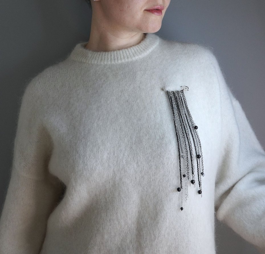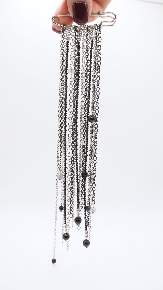 Jako biżuteryjny krawat: Przypięta pod kołnierzykiem koszuli tworzy nowoczesną, elegancką linię.