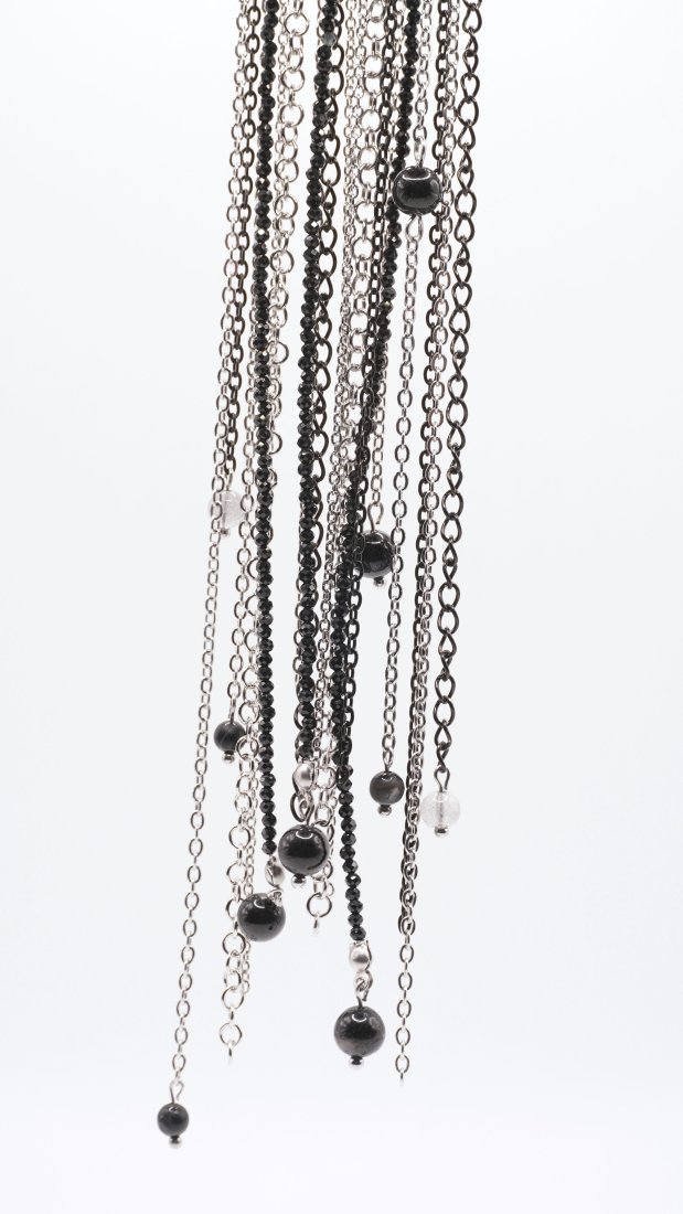 Projekt opiera się na kaskadzie różnorodnych łańcuchów ze stali szlachetnej, które płynnie reagują na każdy ruch. Turmalin dodaje kompozycji unikalności — jego ciemne, niemal czarne ziarna pod odpowiednim kątem rozbłyskują idealnie współgrając z labradorytem.