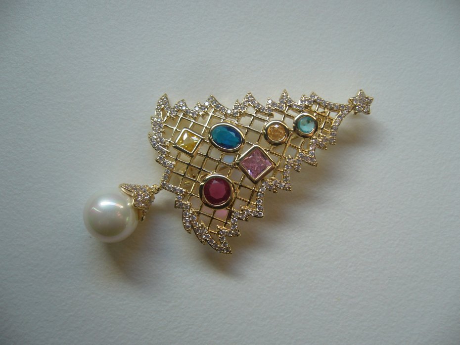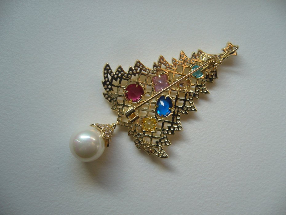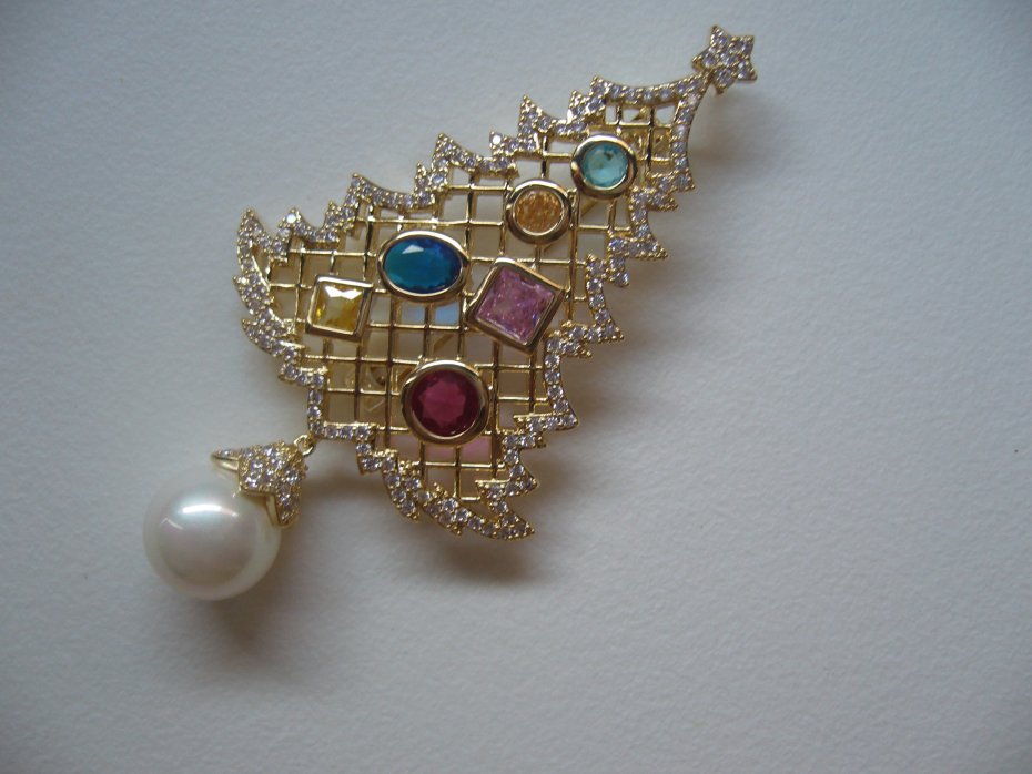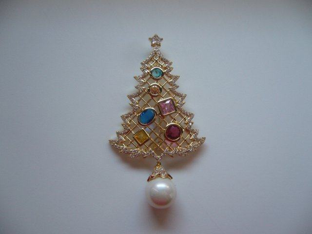 Piękna pozłacana świąteczna broszka choinka,wysadzana szklanymi cyrkoniami zdobiona perełką, perełka jest ruchoma
