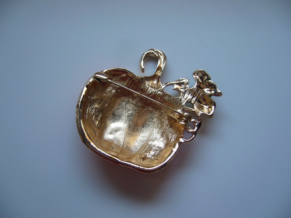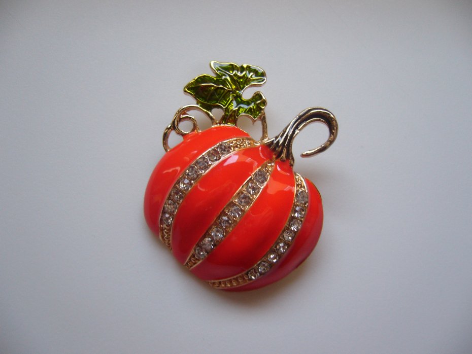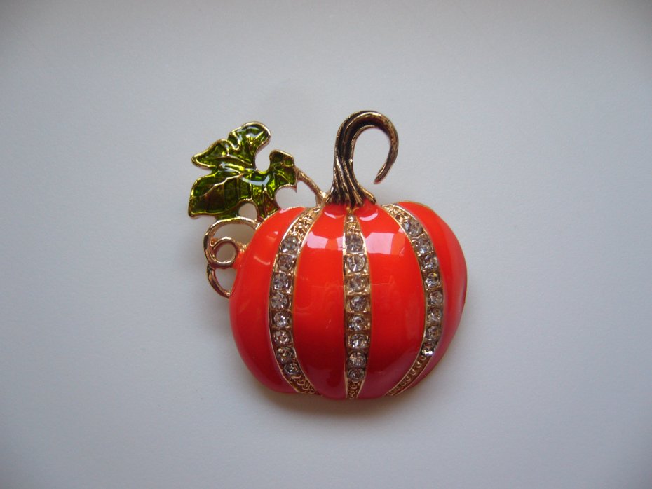 POZŁACANA EMALIOWANA BROSZKA DYNIA,ZDOBIONA KRYSZTAŁKAMI