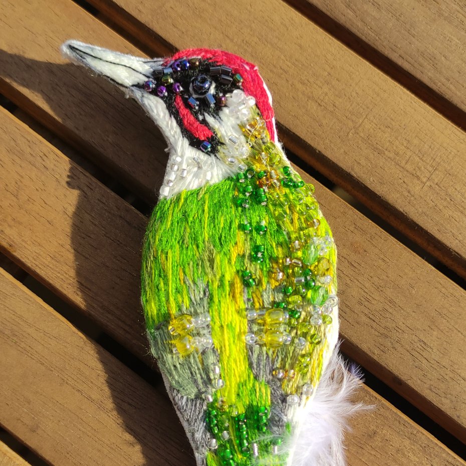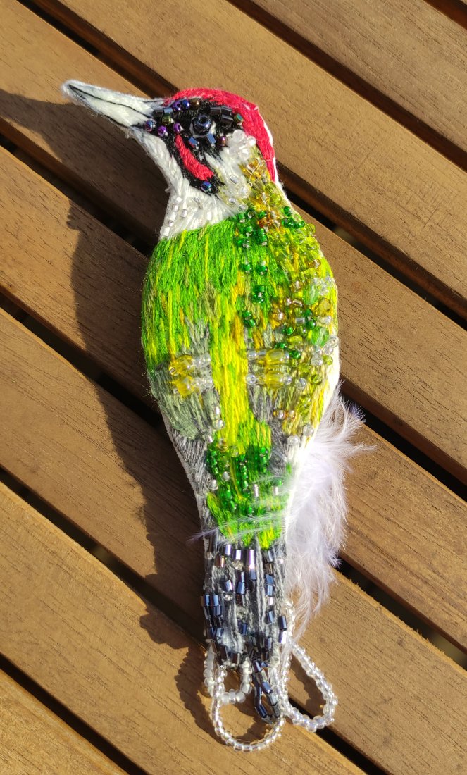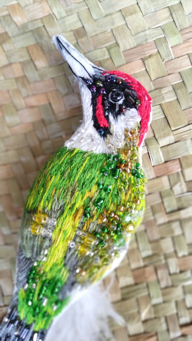 Piękna ręcznie wykonana broszka zielonego dzięcioła w pełni haftowana z dodatkiem szklanych koralików i naturalnych piór.
