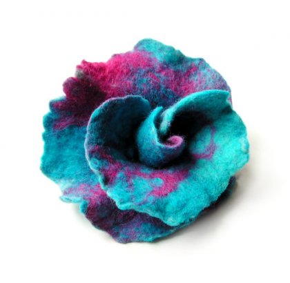 Broszka wykonana z własnoręcznie filcowanej naturalnej, wysokiej jakości wełny z merynosów australijskich. Zapięcie broszkowe. Średnica kwiatka: ok. 10,5cm; wysokość ok. 5,0cm. Kolory - Kolory - odcienie turkusu, fuksja.