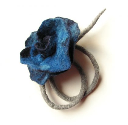Broszka wykonana z własnoręcznie filcowanej naturalnej, wysokiej jakości wełny z merynosów australijskich. Zapięcie broszkowe. Średnica całości: ok. 13cm; średnica kwiatka: 9,0cm; wysokość ok. 6,0cm. Kolory - szary, niebieski, granat.