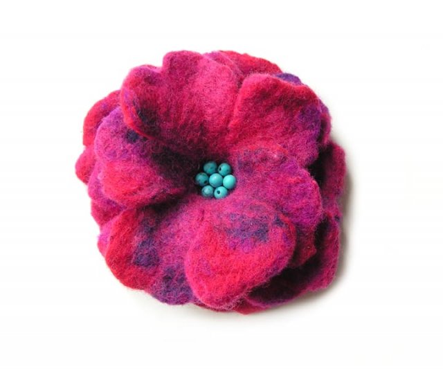 Broszka wykonana z własnoręcznie filcowanej naturalnej, wysokiej jakości wełny z merynosów. Zapięcie broszkowe. Średnica w najszerszym miejscu: ok. 10cm, wysokość ok. 3cm. Kolory - fiolet, fuksja, czerwień, granat.