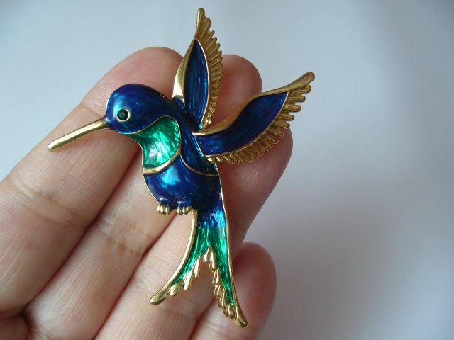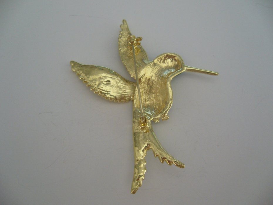 METALOWA,POZŁACANA EMALIOWANA BROSZKA PTAK PTASZEK KOLIBER,OCZKO ZDOBIONE KRYSZTAŁKIEM