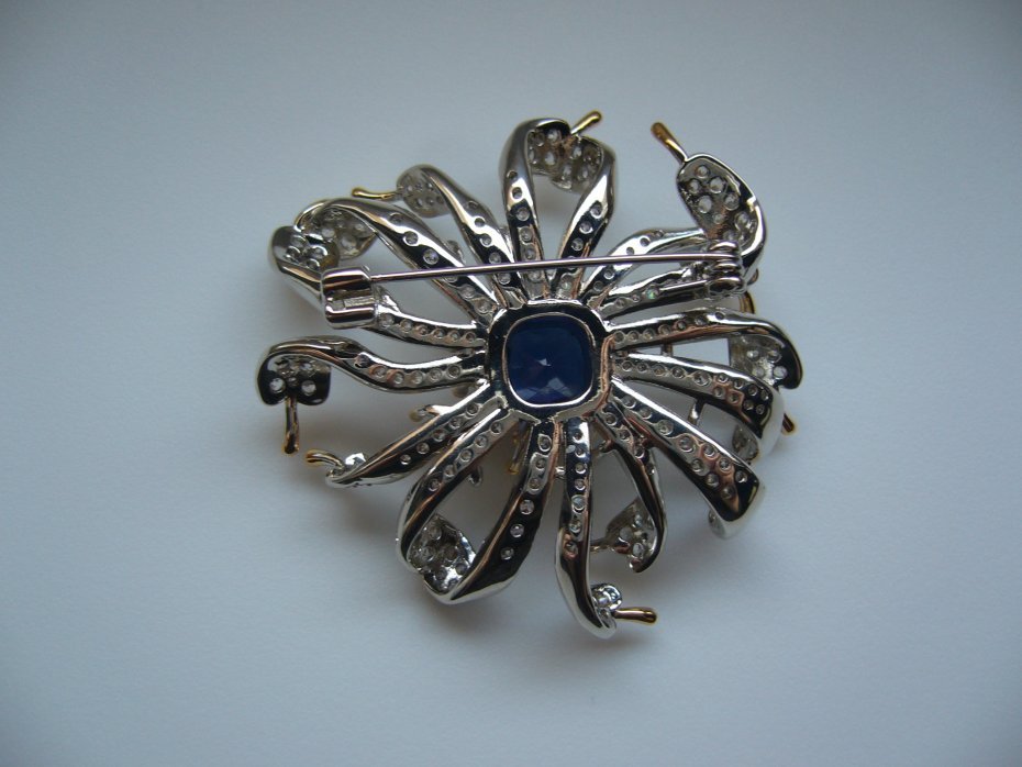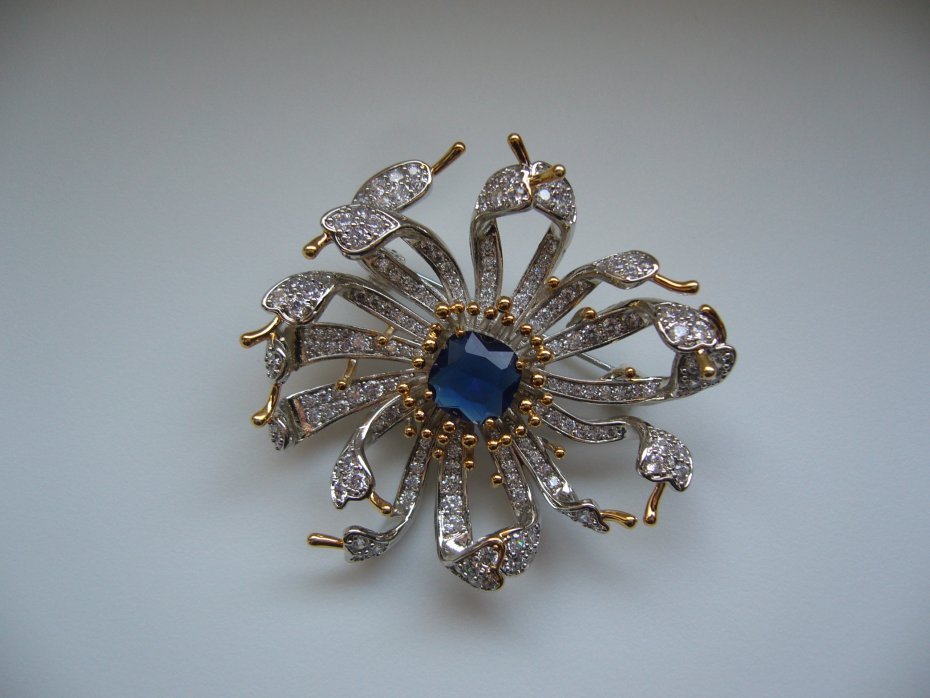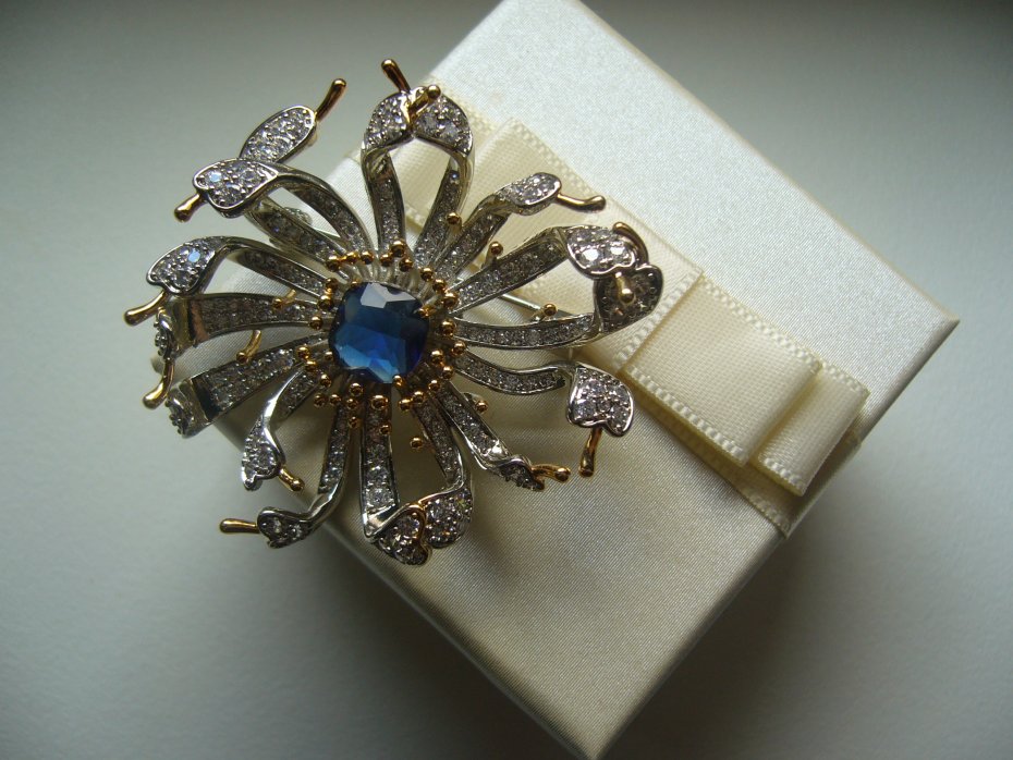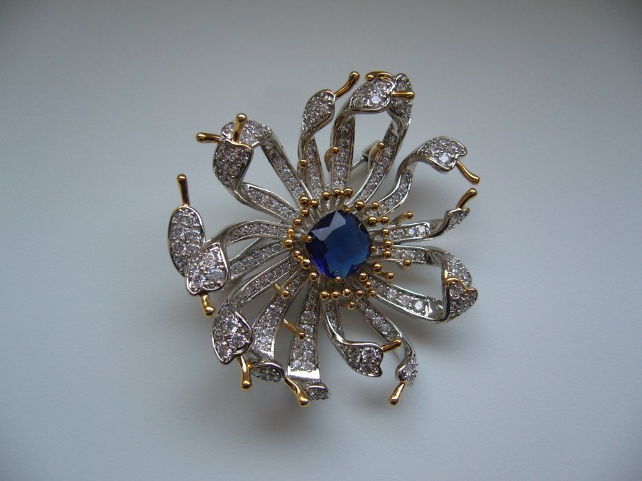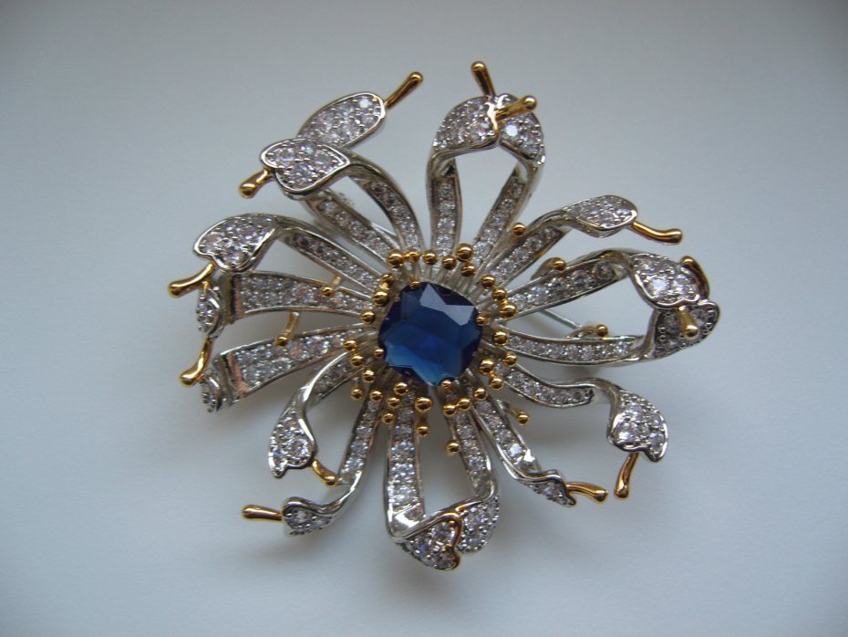 UROCZA SREBRNO ZŁOTA BROSZKA KWIAT, ZDOBIONA NIEBIESKIM KAMIENIEM I KRYSZTAŁKAMI