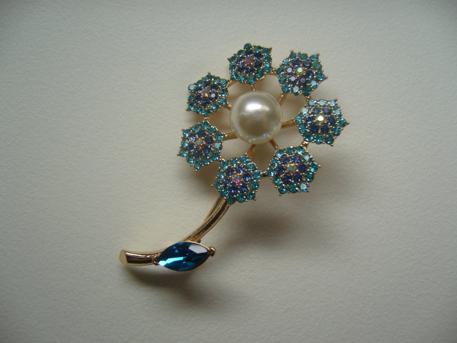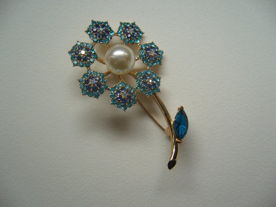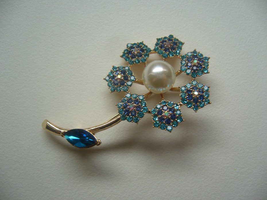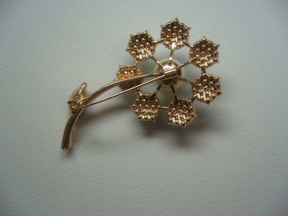 PIĘKNA POZŁACANA BROSZKA KWIATEK ZDOBIONA PEREŁKĄ I KRYSZTAŁKAMI