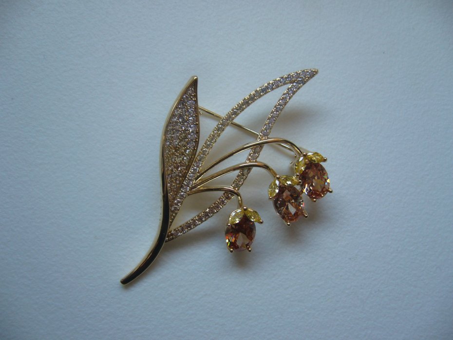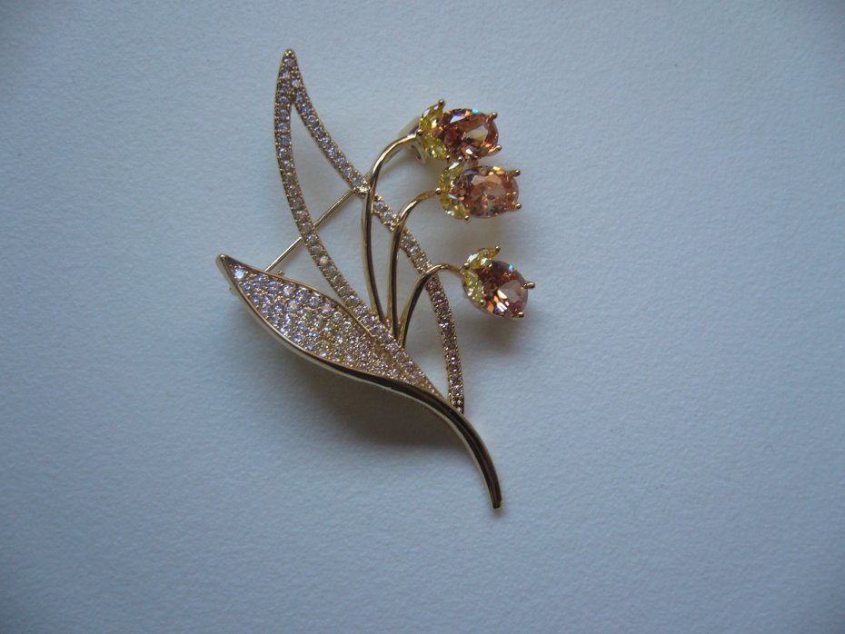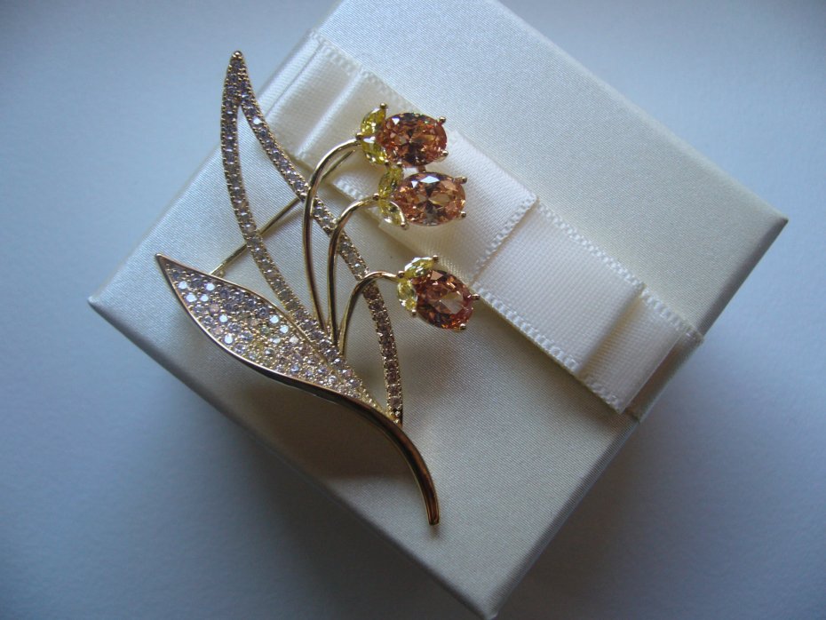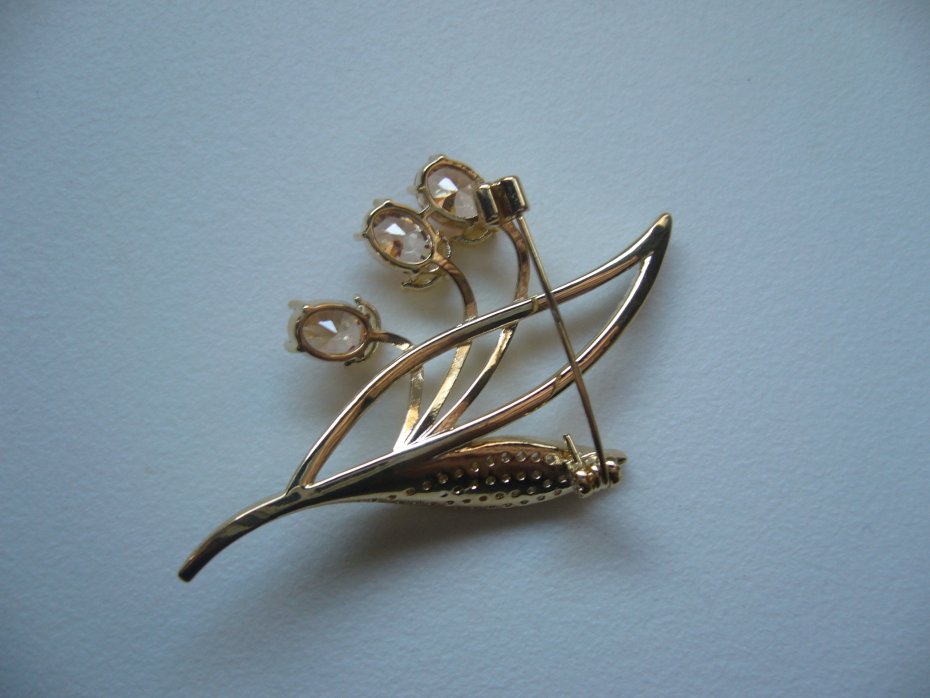 PIĘKNA POZŁACANA BROSZKA KWATY NA GAŁĄZCE ZDOBIONA SZKLANYMI CYRKONIAMI