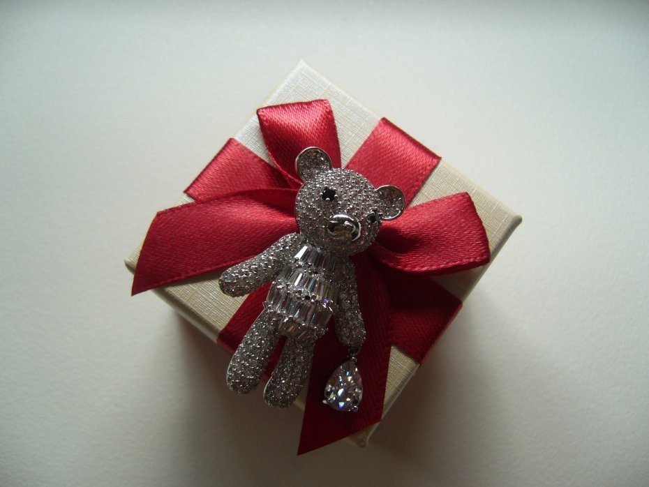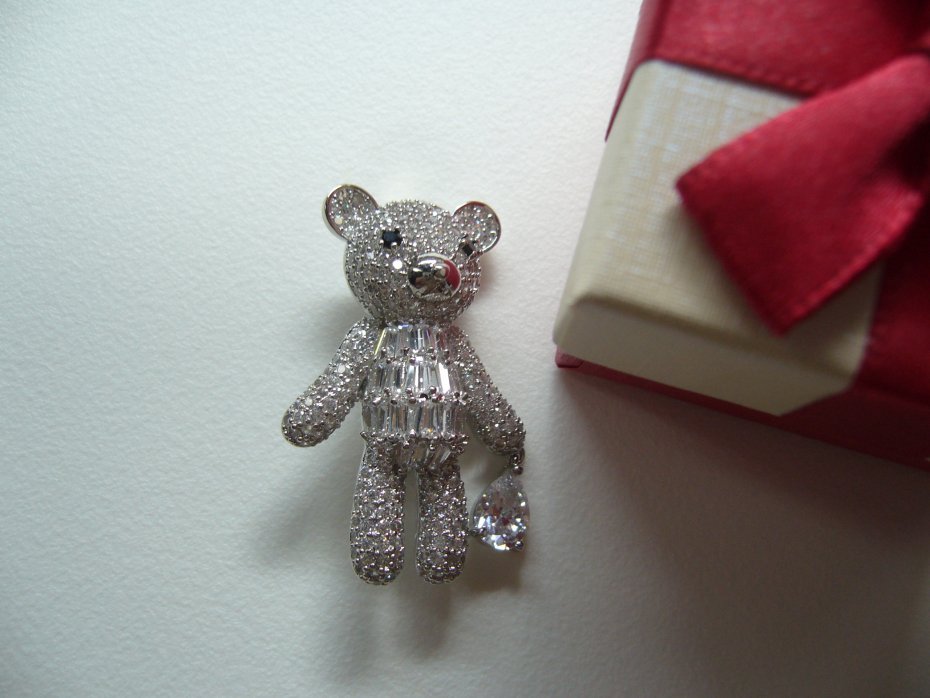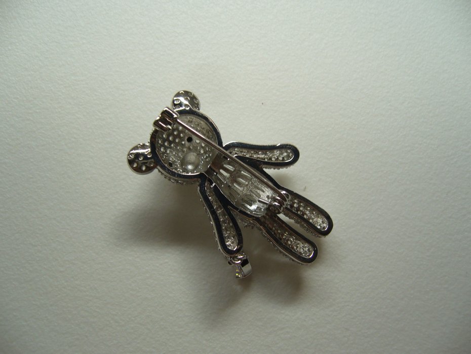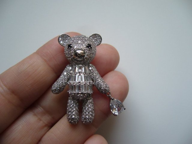 UROCZA POSREBRZANA BROSZKA MIŚ , ZDOBIONA SZKLANYMI CYRKONIAMI