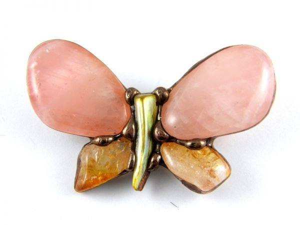 Niepowtarzalna broszka wykonana ręcznie z naturalnych kamieni: kwarcu różowego i cytrynów, oprawionych w metal.