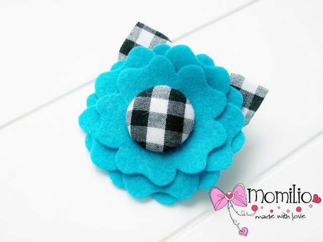 Broszka kwiatuszek uszyty z filcu merino ozdobiony ręcznie zrobionym guzkiem i listkami w czarno białą kratkę. Śr. kwiatuszka bez listków 5,5 cm. Zapięcie broszkowe.
