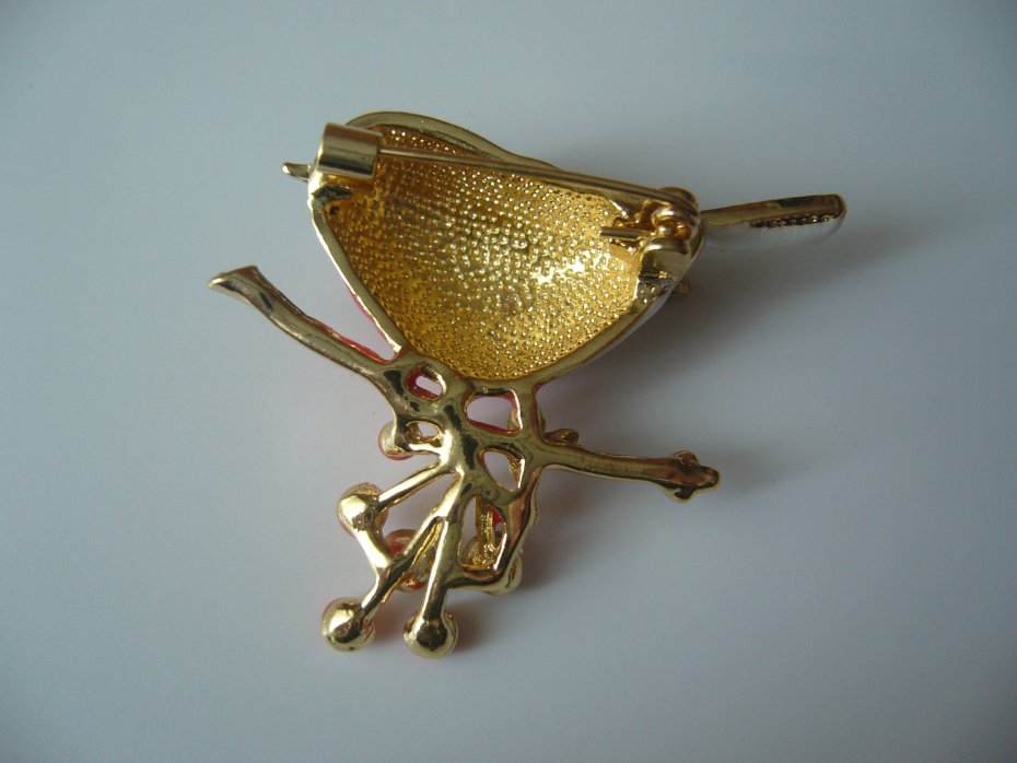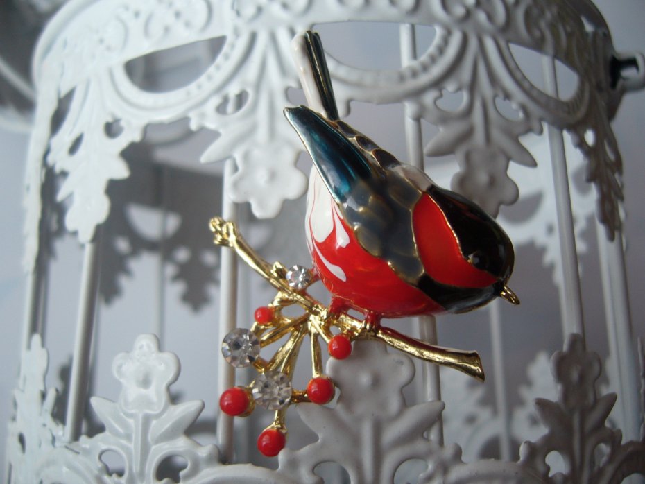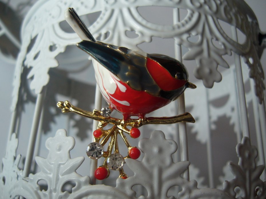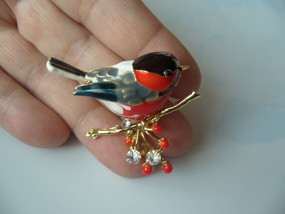 NOWA EMALIOWANA BROSZKA PTASZEK NA GAŁĘZI , ZDOBIONA KRYSZTAŁKAMI