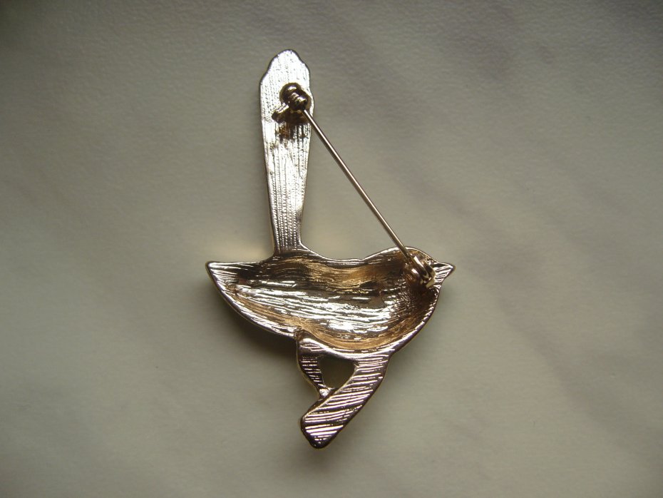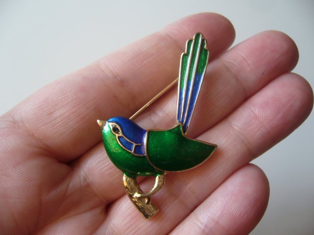 Metalowo emaliowana broszka ptaszek,oczko zdobione kryształkiem
