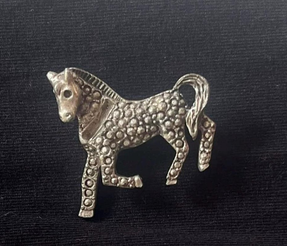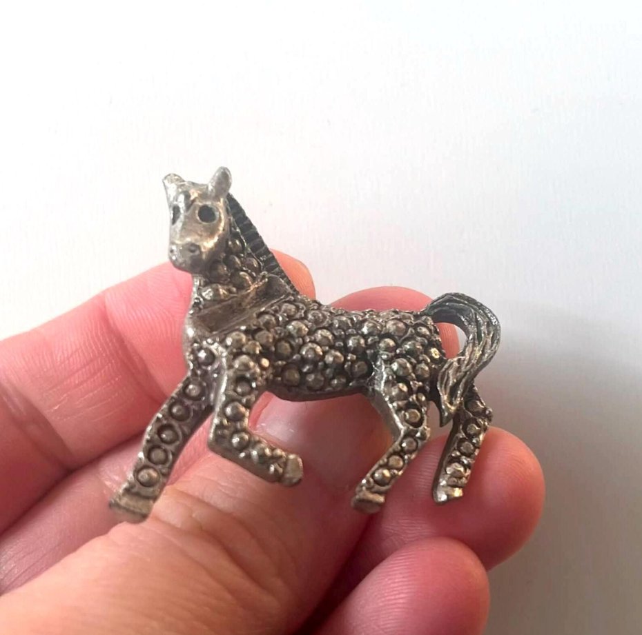Urocza czeska broszka w stylu vintage z motywem konia, charakteryzująca się pięknym, teksturowanym wykończeniem w srebrnym odcieniu.