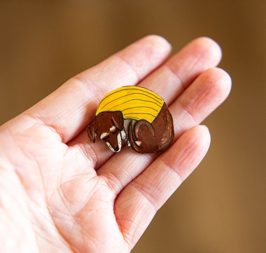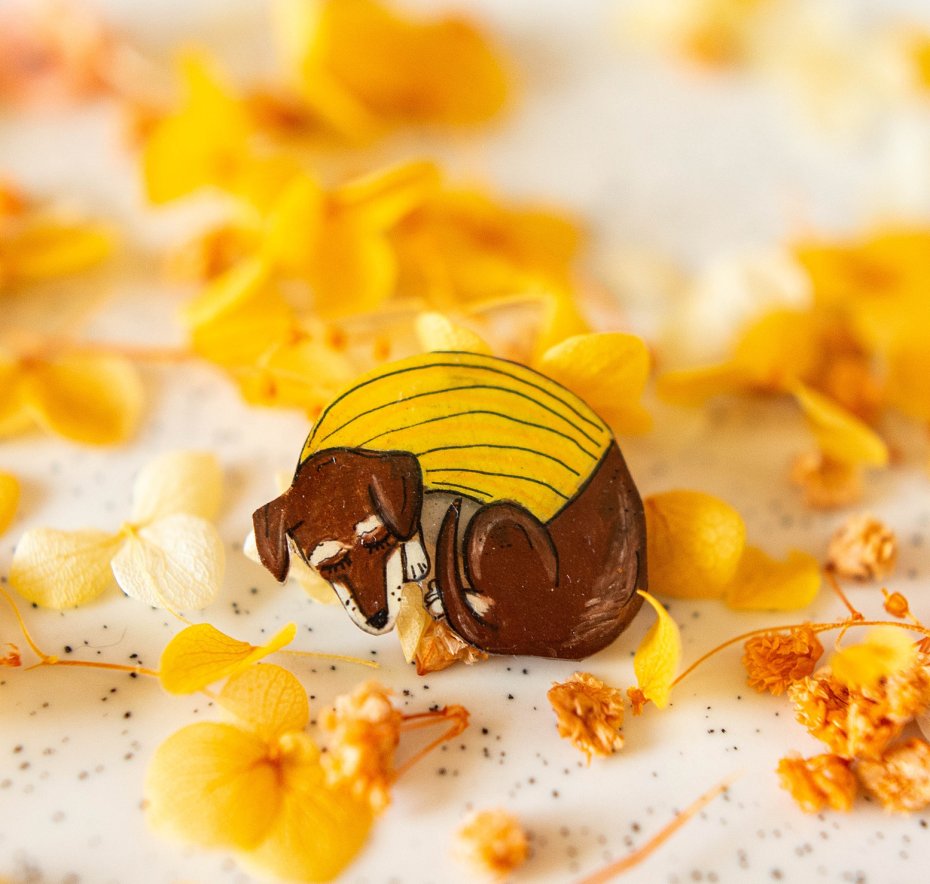 Urocza broszka z jamnikiem to mały detal, który od razu przyciąga spojrzenia. Przedstawia śpiącego pieska otulonego żółtym sweterkiem – idealny motyw dla miłośników zwierząt i subtelnych, ciepłych akcentów w stylizacji.