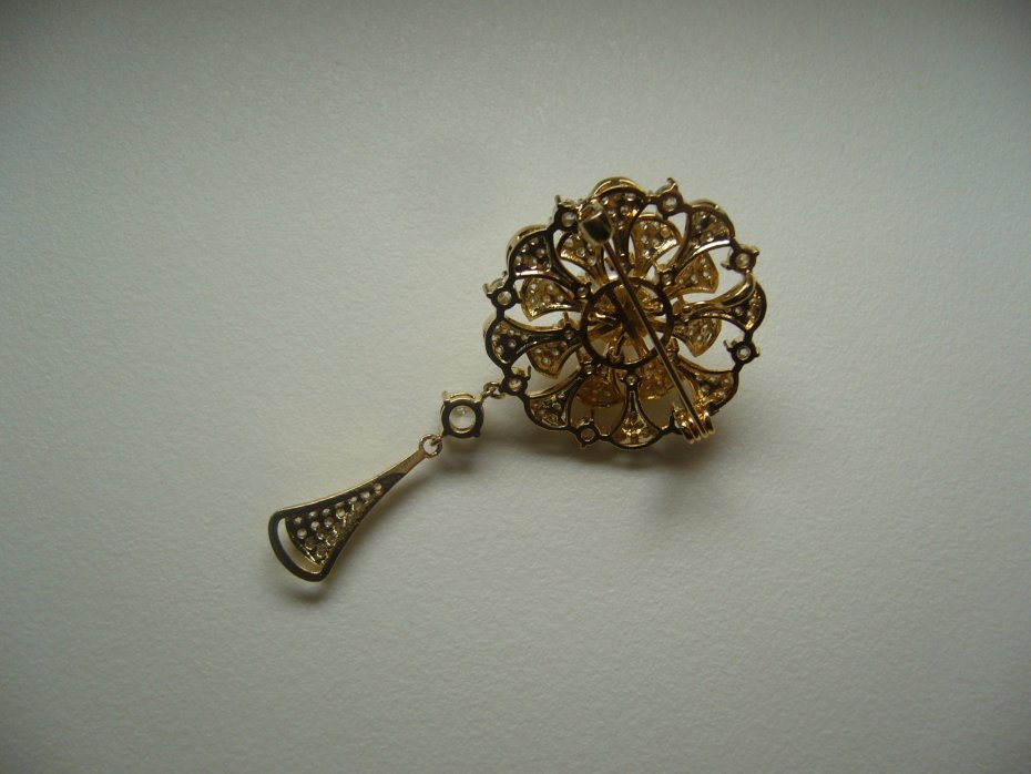 PIĘKNA POZŁACANA BROSZKA ROZETA ZDOBIONA CYRKONIAMI I PERŁĄ
