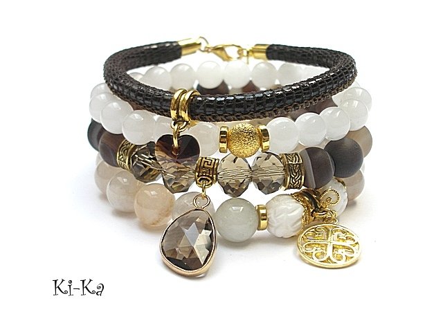 Komplet czterech bransoletek wykonanych z naturalnych kamieni - kamień księżycowy [10mm], agat matowy [10mm], muszla rzeźbiona [10mm], jadeity [8mm], efektownej zawieszki ze szkła, rzemienia z naturalnej, miękkiej skórki, kryształków fasetowanych [8 x 10mm], przywieszki z kryształkiem Swarovskiego w kształcie serca oraz elementów metalowych w kolorze złota. Pasują na nadgarstek 16 - 17cm . Biżuteria ozdobnie zapakowana.