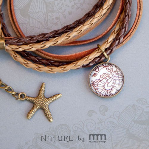 Bransoletka z możliwością noszenia jako naszyjnik, to bardzo romantyczne, nostalgiczne i kobiece malutkie dzieło sztuki. Obrazek pod szkiełkiem to autorska ilustracja. Bransoletka z kilku rzemieni prezentuje się wspaniale, a zawieszka oraz medalion dopełniają romantyczną stylistykę .