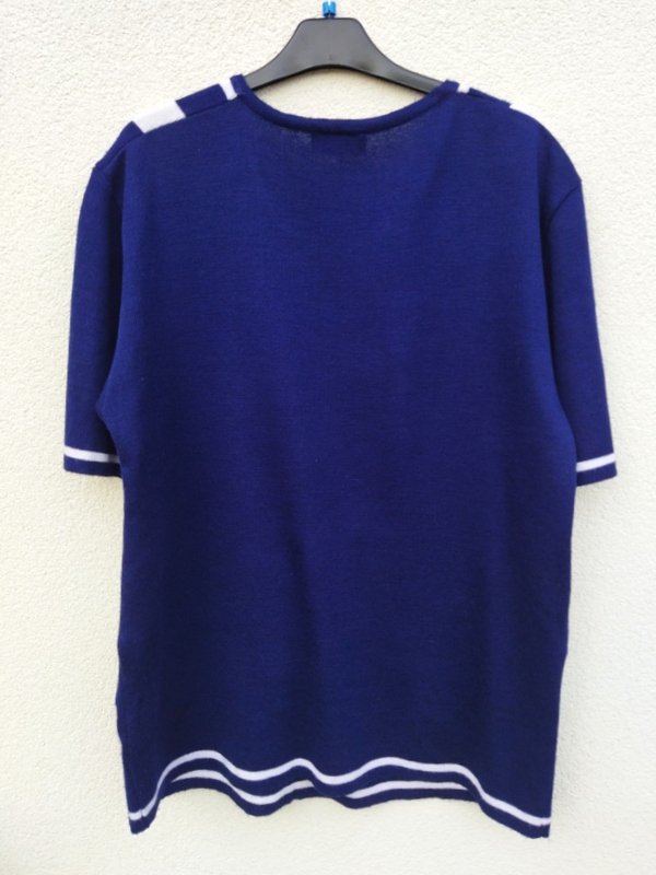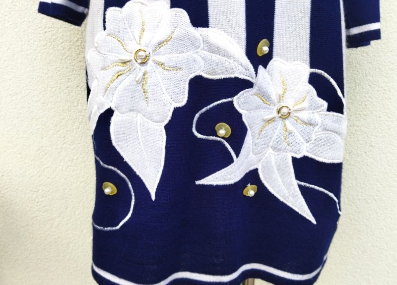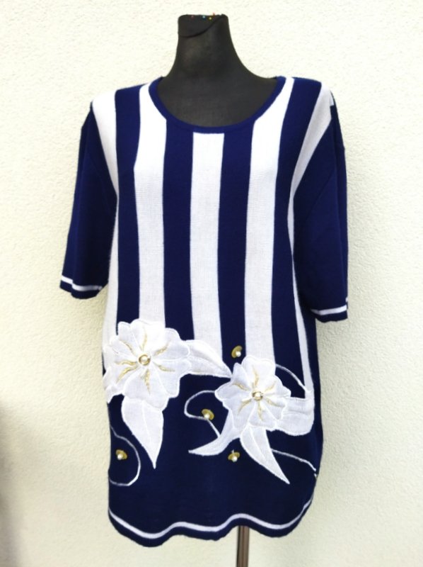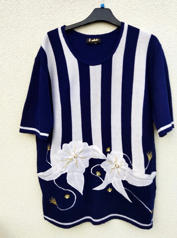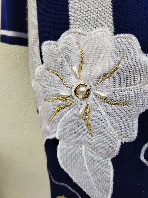 Unikatowy akrylowo-bawełniany sweterek w granatowo białej kolorystyce z biżuteryjnymi elementami i kwiatowymi aplikacjami zdobionymi perełkami i haftem metaliczną złotą nitką.