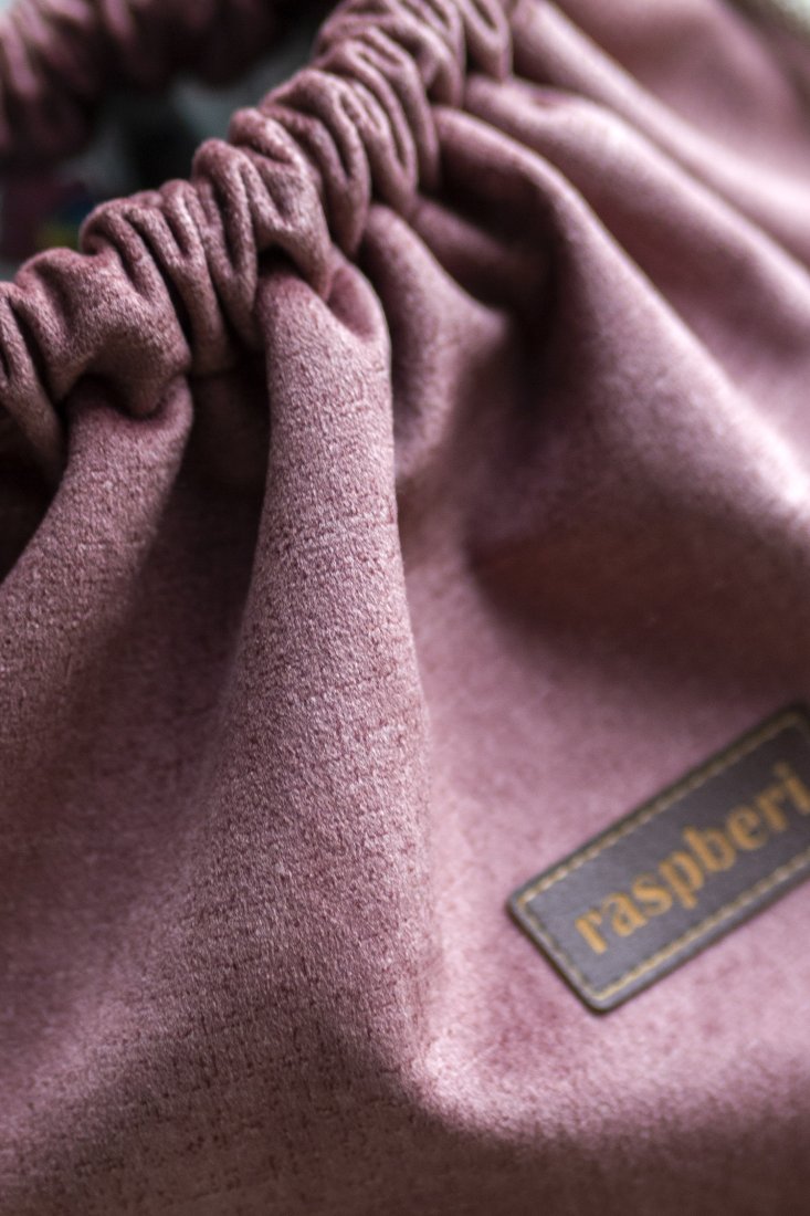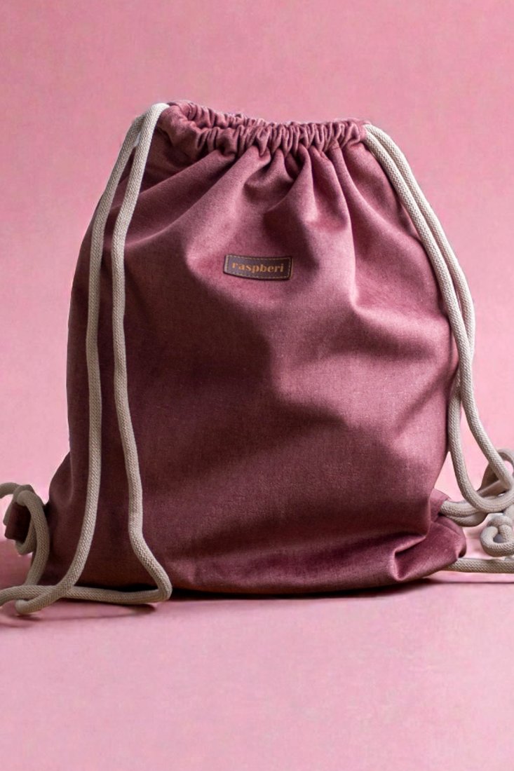 Plecak worek wykonany z weluru w kolorze brudnoróżowym.