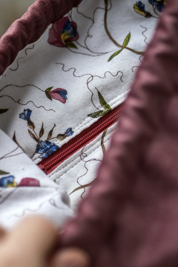 Biała, bawełniana podszewka w kwiaty. Kieszonka w środku.