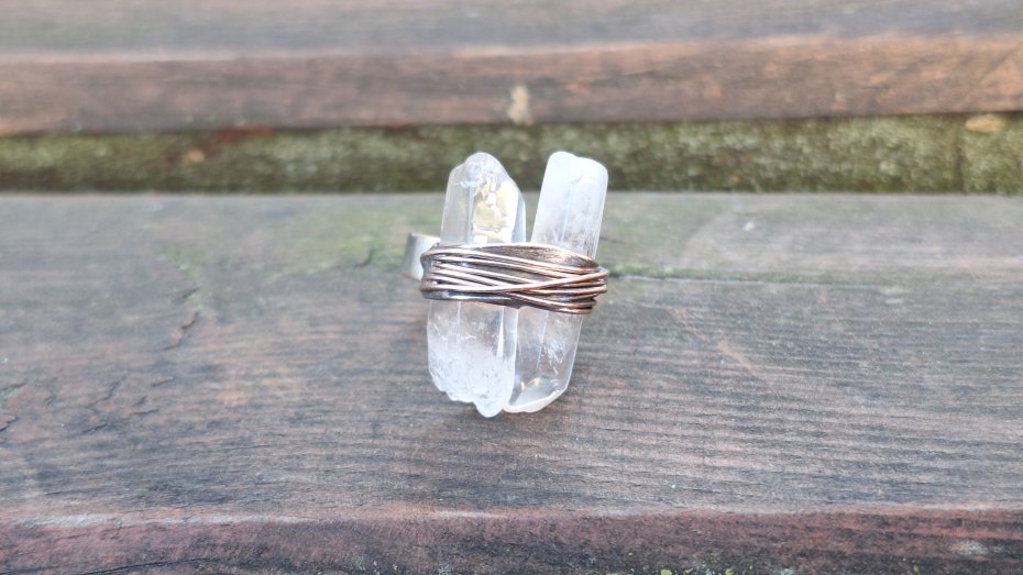 Pierścionek wykonany z miedzi, cyny i kryształu górskiego. Wymiary ok. 2.5 na 1.7 cm. Regulowany. Nie jest ciężki.