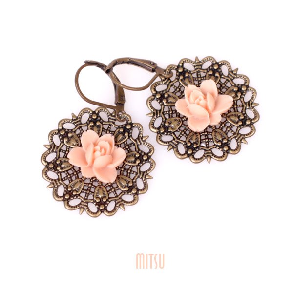 Wiszące kolczyki w kolorze starego złota i jasnej brzoskwini. Rozeta ażurowa mierzy 2,5cm. Słodko pudrowe, ładnie zapakowane. :)) Gorąco polecam :) Dostępne są również kolczyki z kwiatem w kolorze turkusowym , różowym i kobaltowym.