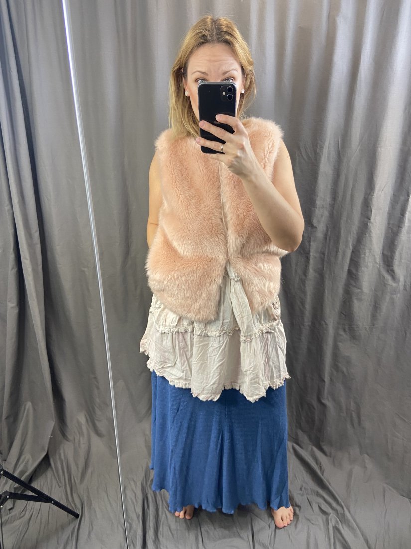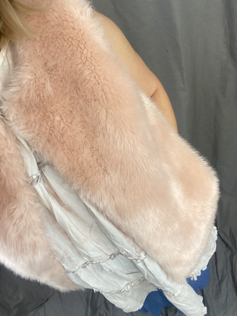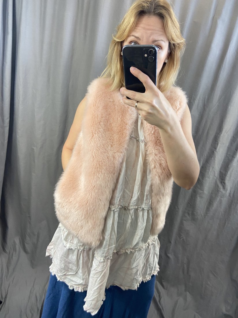 Brzoskwiniowe boskości. Kamizelka od Topshop zapinana na haftki. Sztuczne futeko, kieszenie, satynowa podszewka.