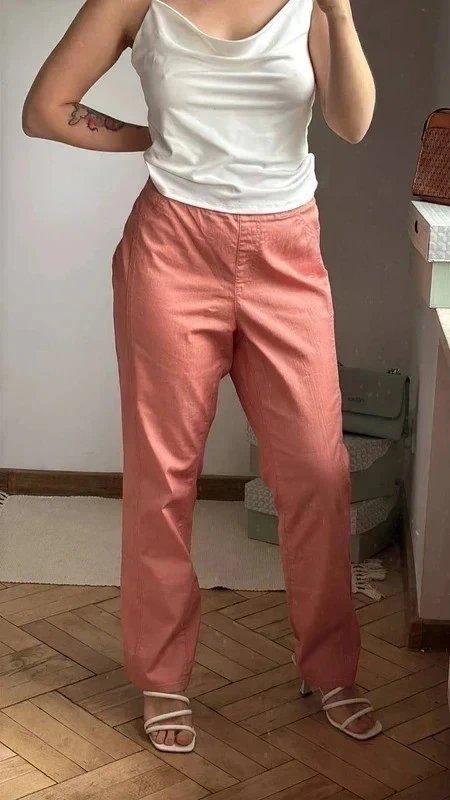 Lekkie spodnie w koralowym odcieniu, wykonane z miękkiej, elastycznej tkaniny o delikatnym połysku. Charakteryzują się wygodnym, szerokim pasem z gumką, który idealnie dopasowuje się do sylwetki. Fason prosty z lekko zwężanymi nogawkami