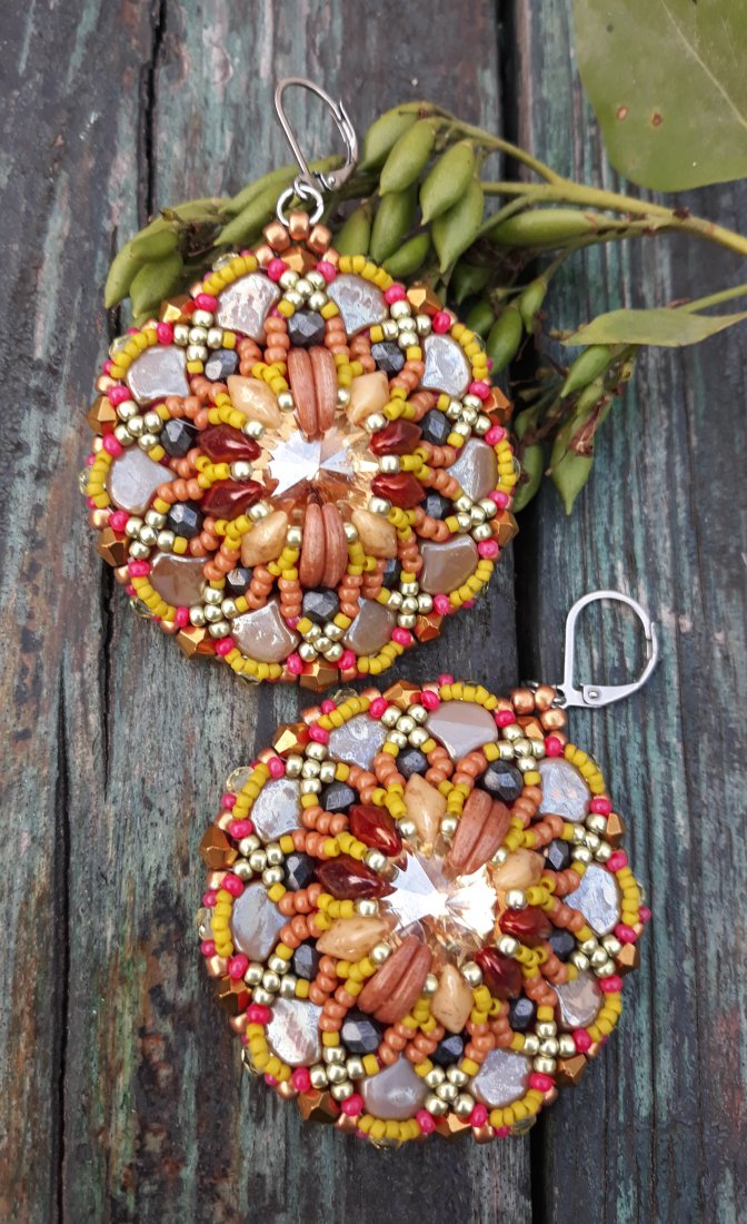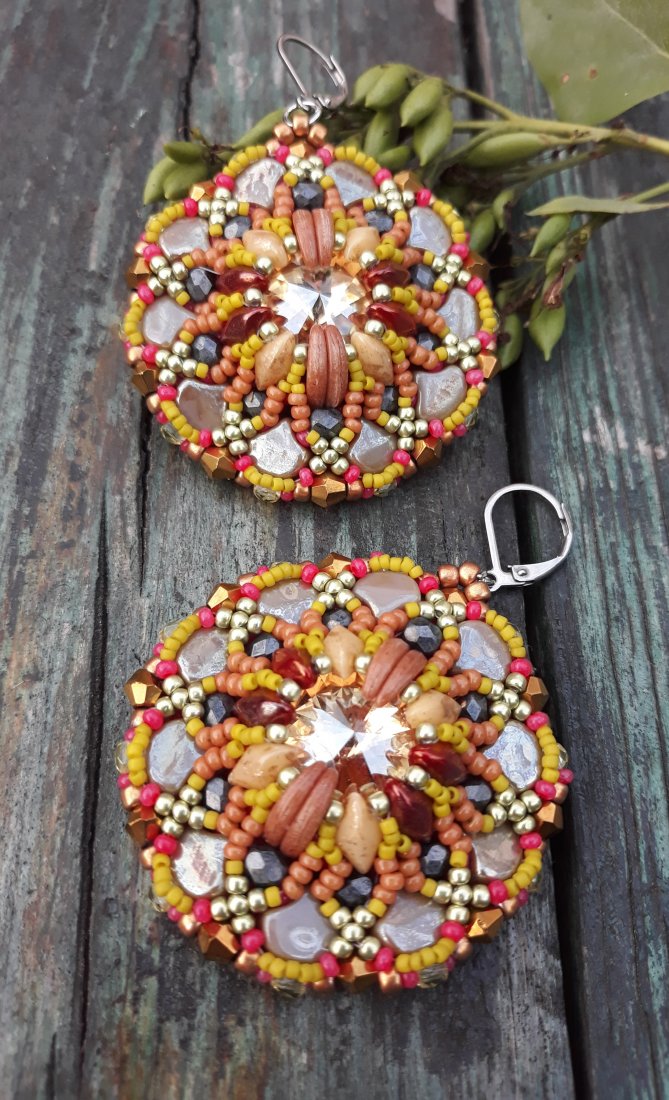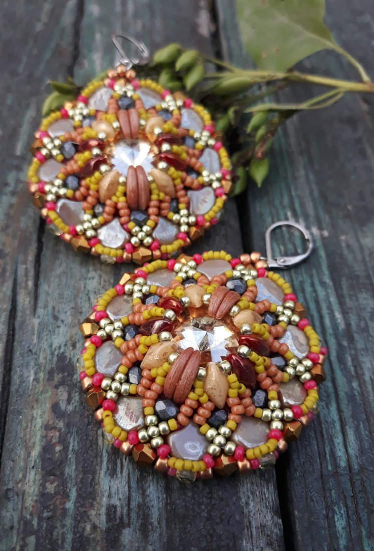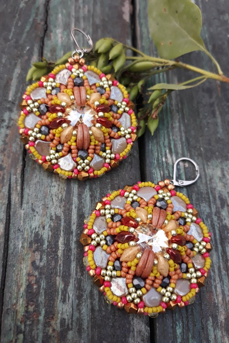 ,,brzoskwiniowe talerze,, to oryginalne i wyraziste kolczyki, które wykonane są ze szklanych koralików i kryształków w różnych odcieniach beżu, złota i czerwieni. Kolczyki zawieszone są na ozdobnych biglach typu angielskiego wykonanych ze stali szlachetnej.