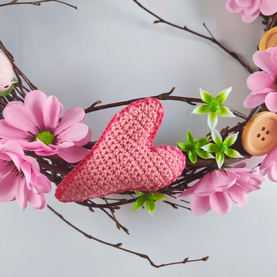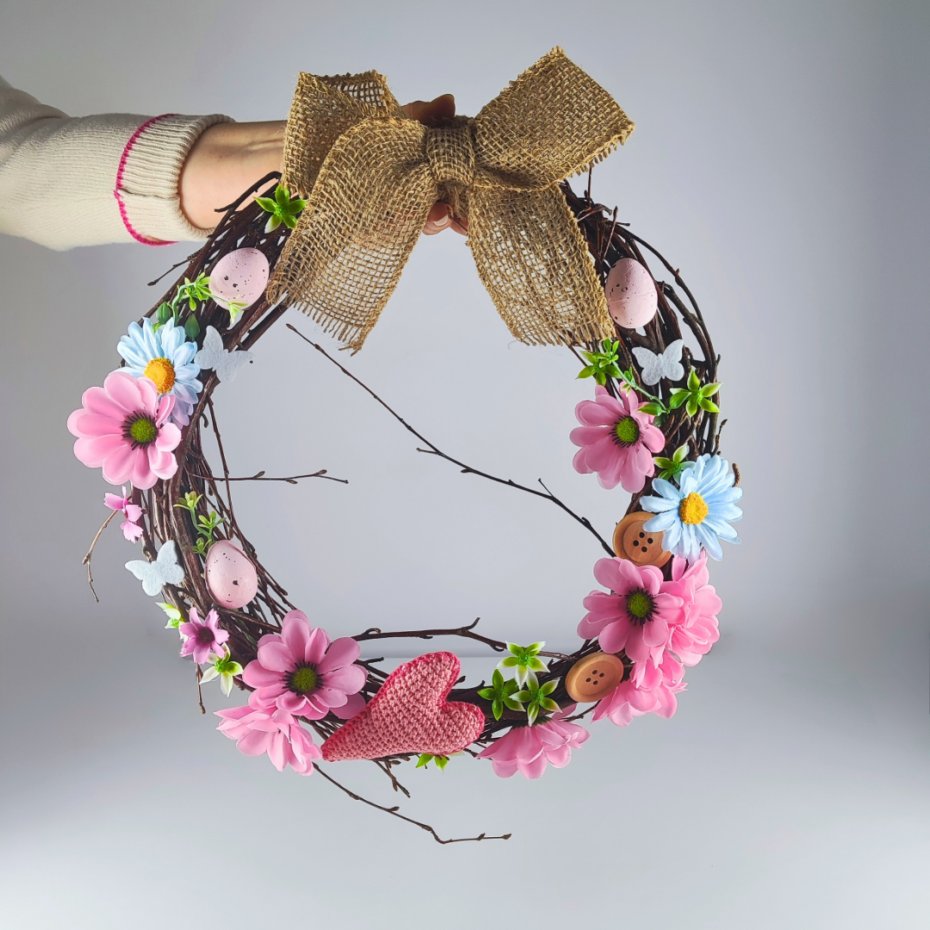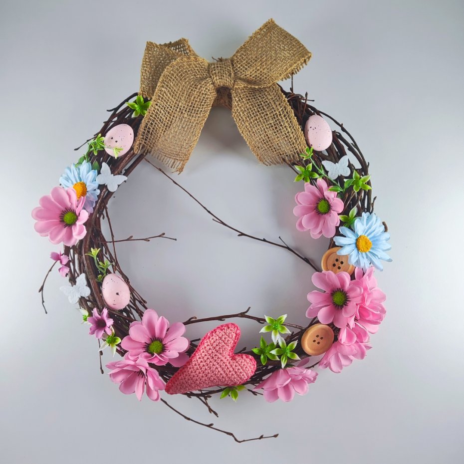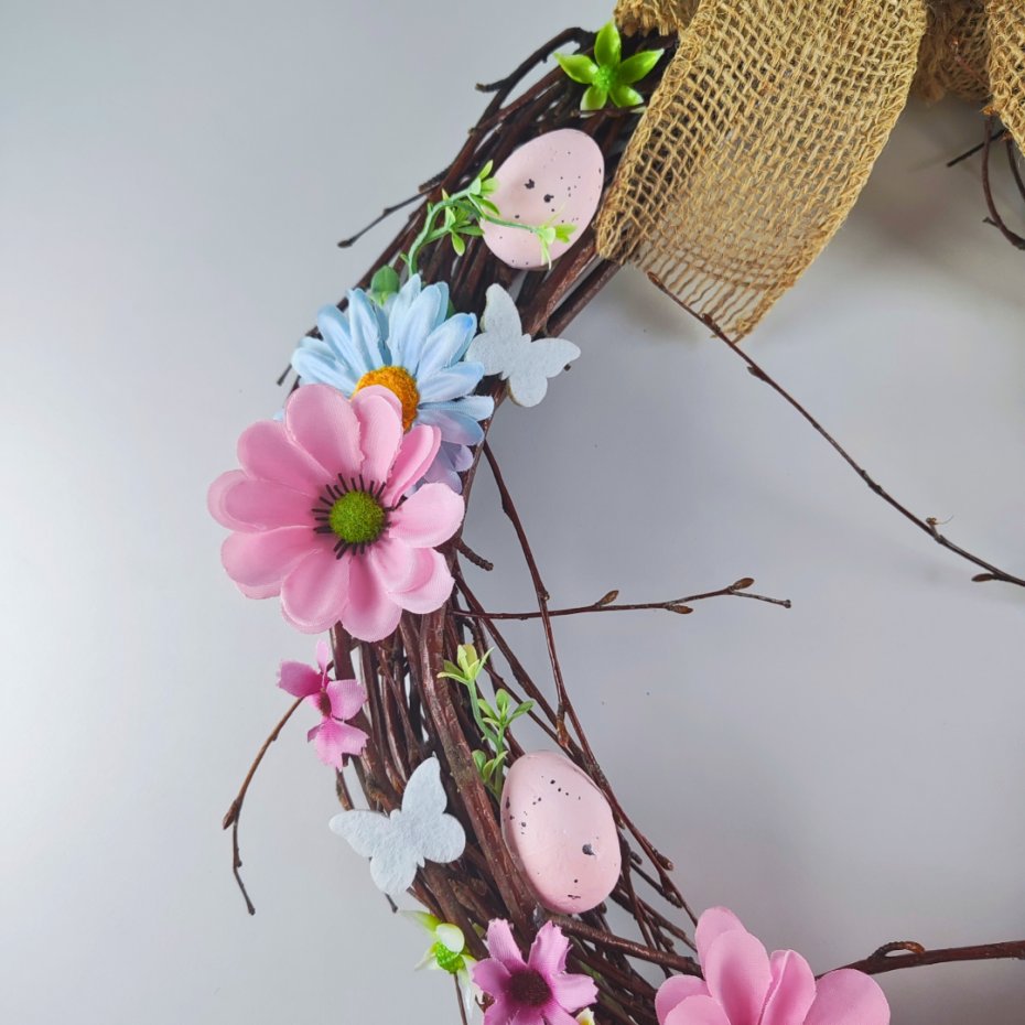 Wianek wielkanocny na drzwi. Wianek z brzozy udekorowany sztucznymi kwiatami, drewnianymi guzikami, szydełkowym sercem, styropianowymi jajkami i motylkami z filcu. Kokarda z juty.
